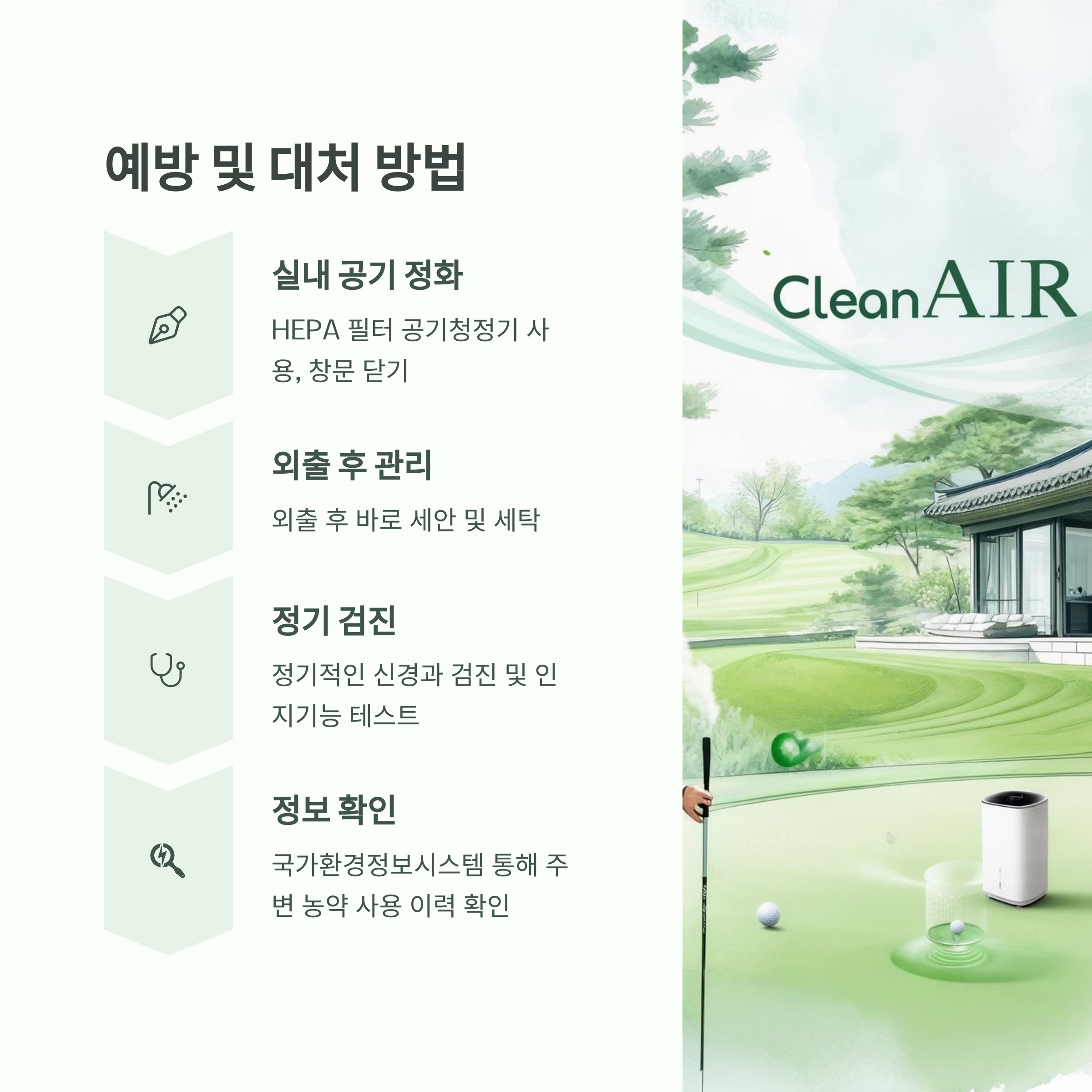 - 실내 공기 정화: HEPA 필터 공기청정기 사용, 창문 닫기