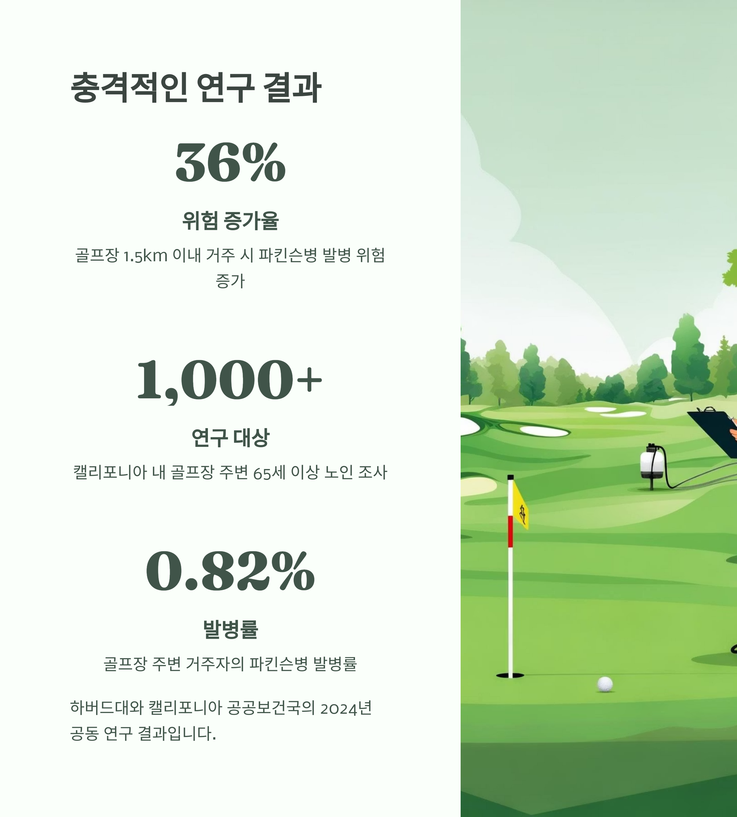 📊 연구 요약: “골프장 반경 1.5km 이내, 파킨슨병 위험 최대 36% 증가”