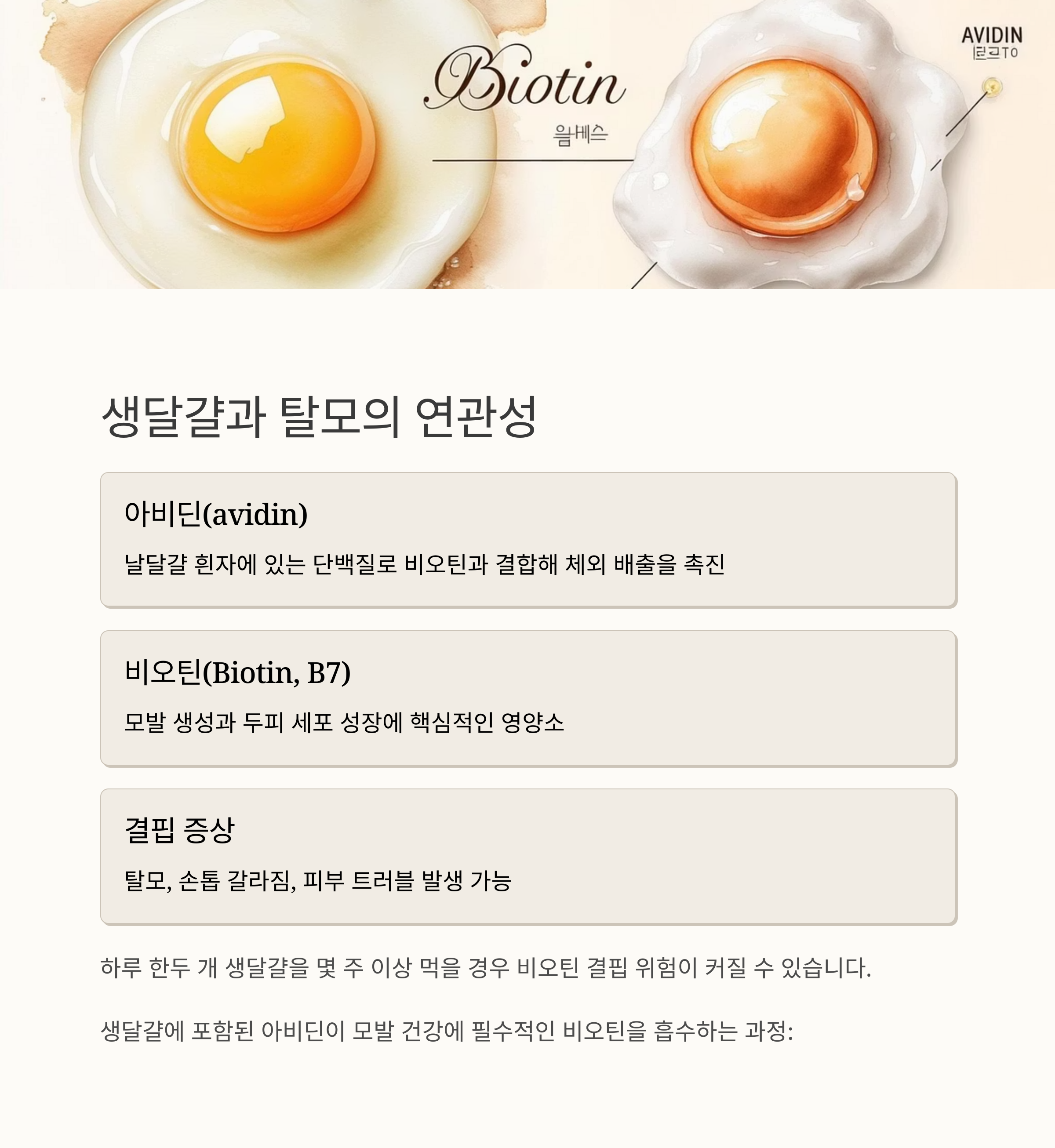| 비오틴 (B7) | 모발 생성, 케라틴 대사 | 아비딘이 흡수 방해 |