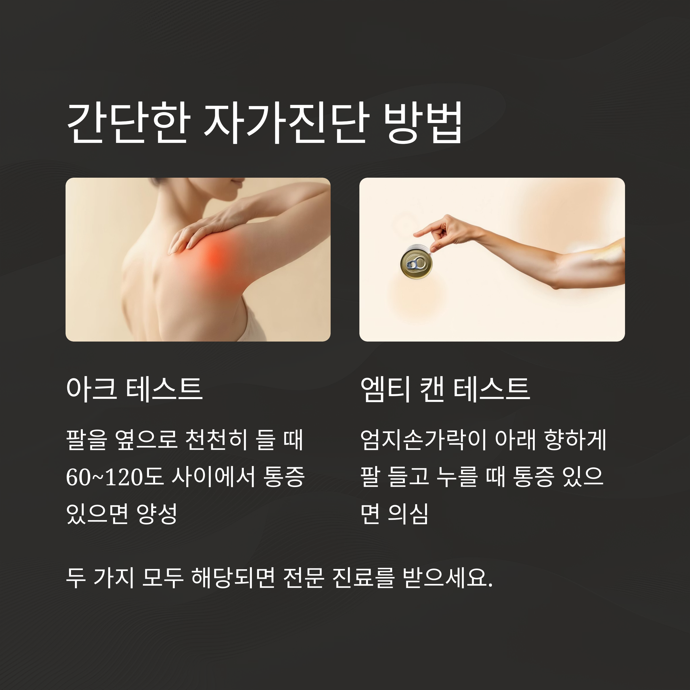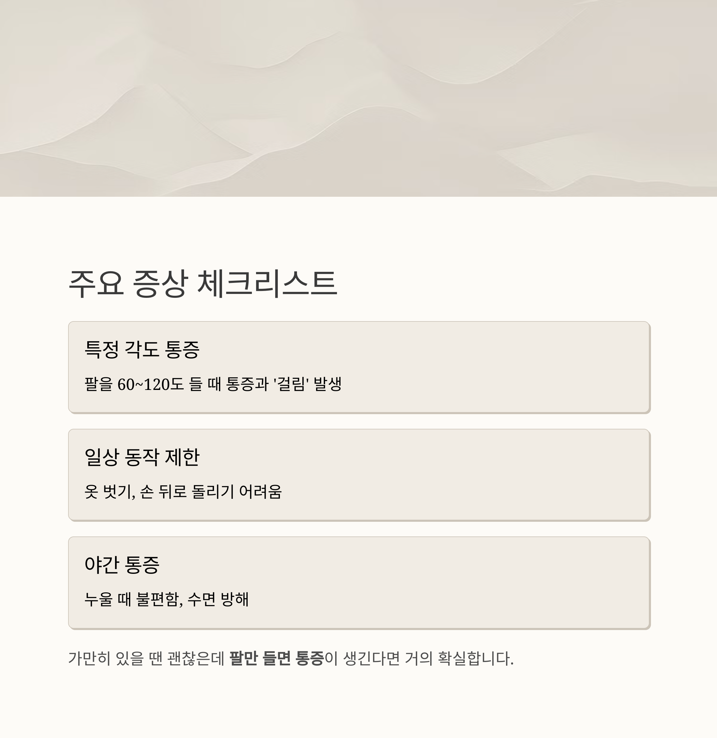 중요 포인트: 가만히 있을 땐 괜찮은데 팔만 들면 통증이 생긴다면 거의 확실합니다.
