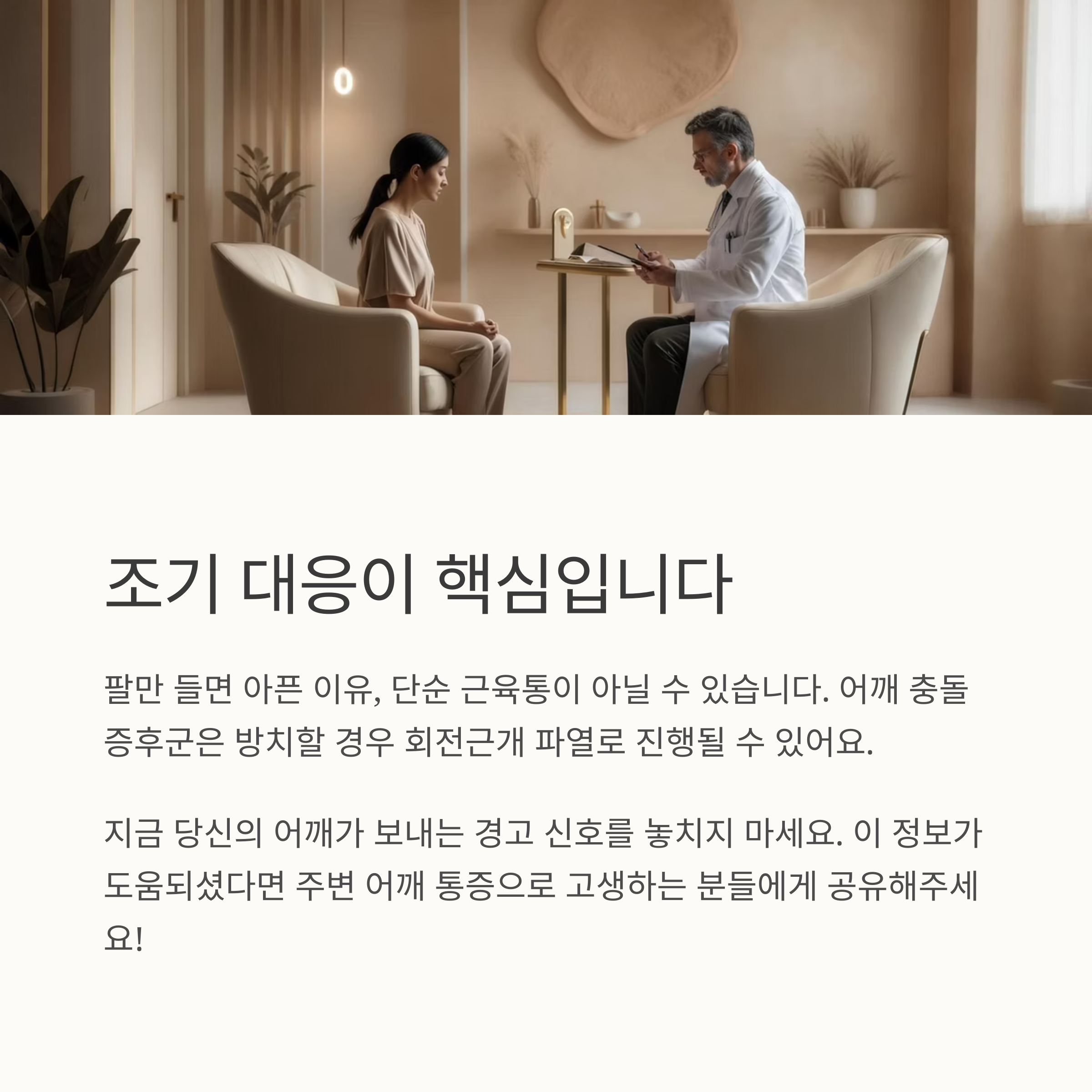 어깨 충돌증후군은 조기 대응이 핵심이며, 방치할 경우 회전근개 파열로 진행될 수 있습니다.