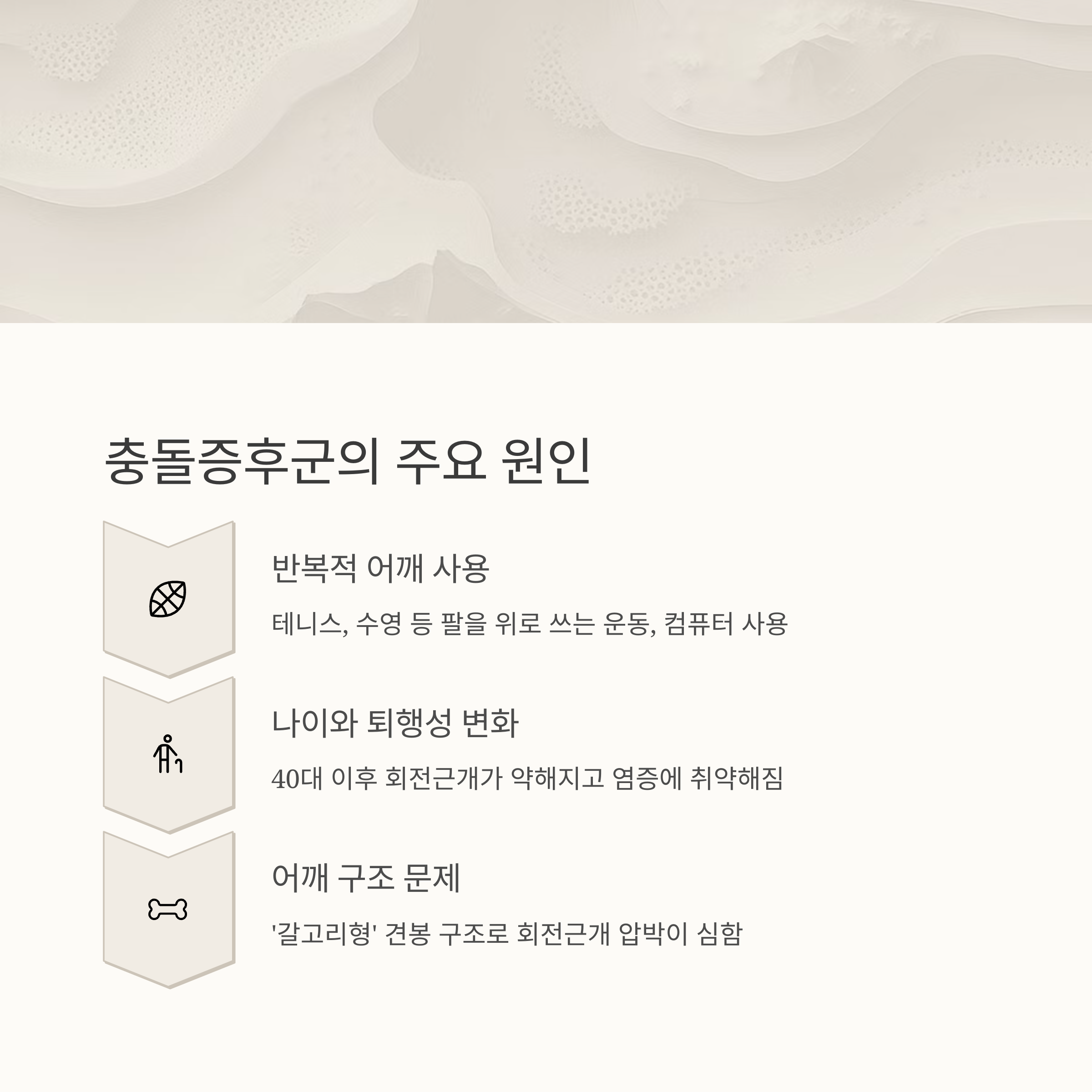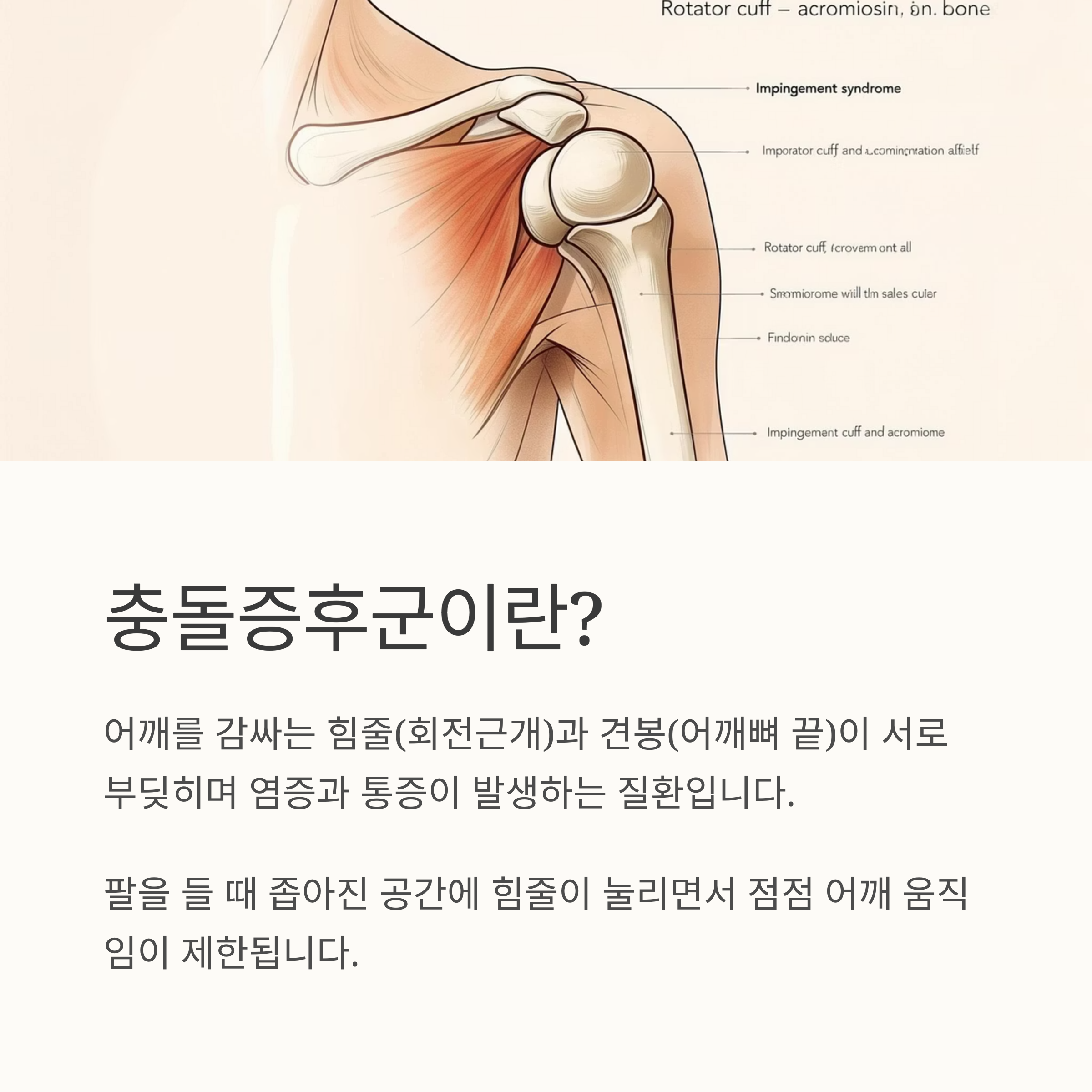 충돌증후군은 어깨를 감싸는 힘줄(회전근개)과 견봉(어깨뼈 끝)이 서로 부딪히며 염증과 통증이 발생하는 질환입니다.