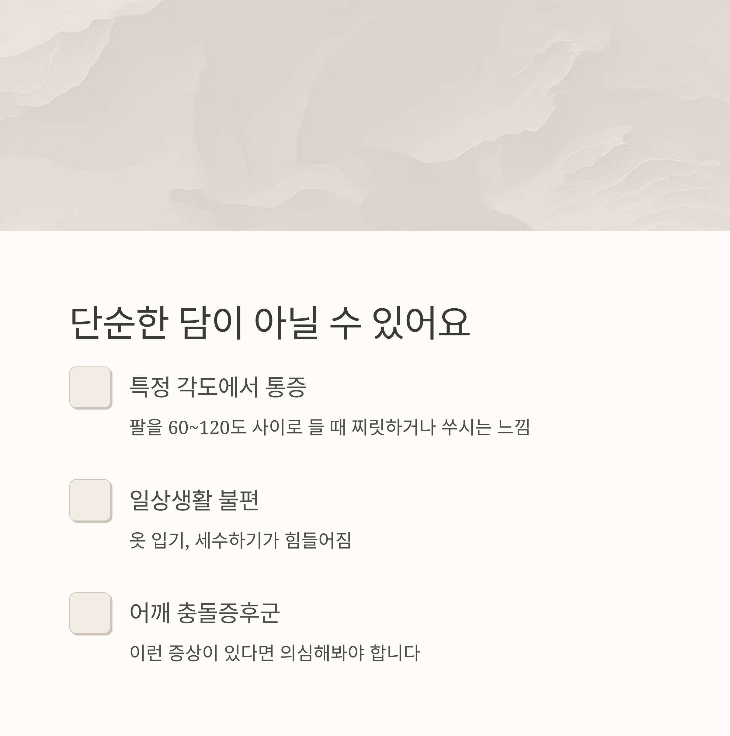 팔을 들 때 "찌릿", "쑤심", "걸리는 느낌"이 반복된다면 단순한 담이 아닐 수 있습니다.