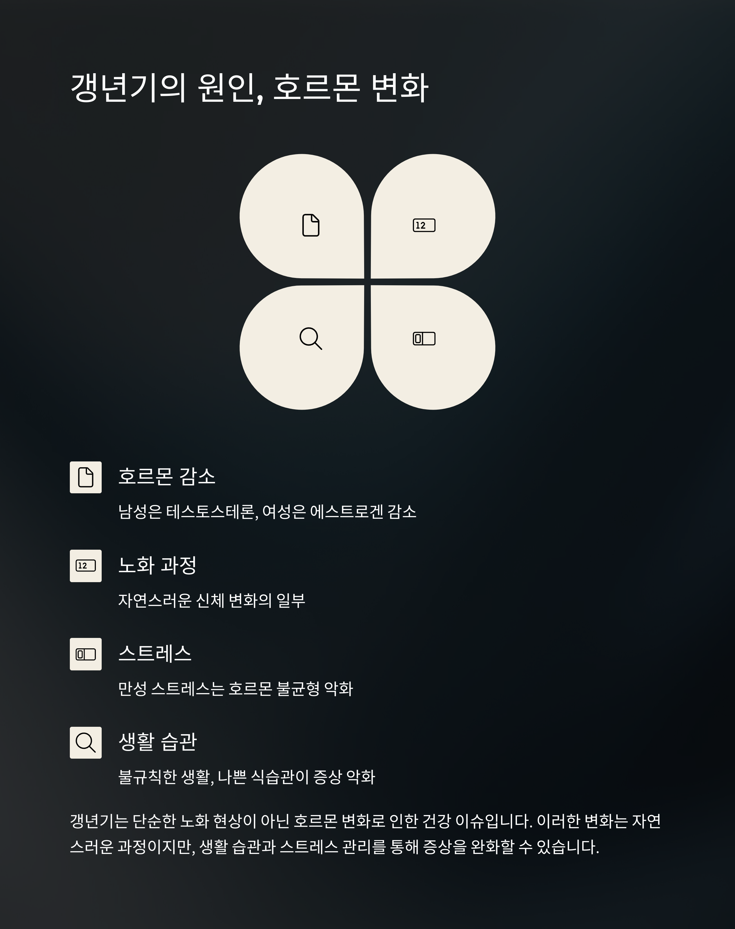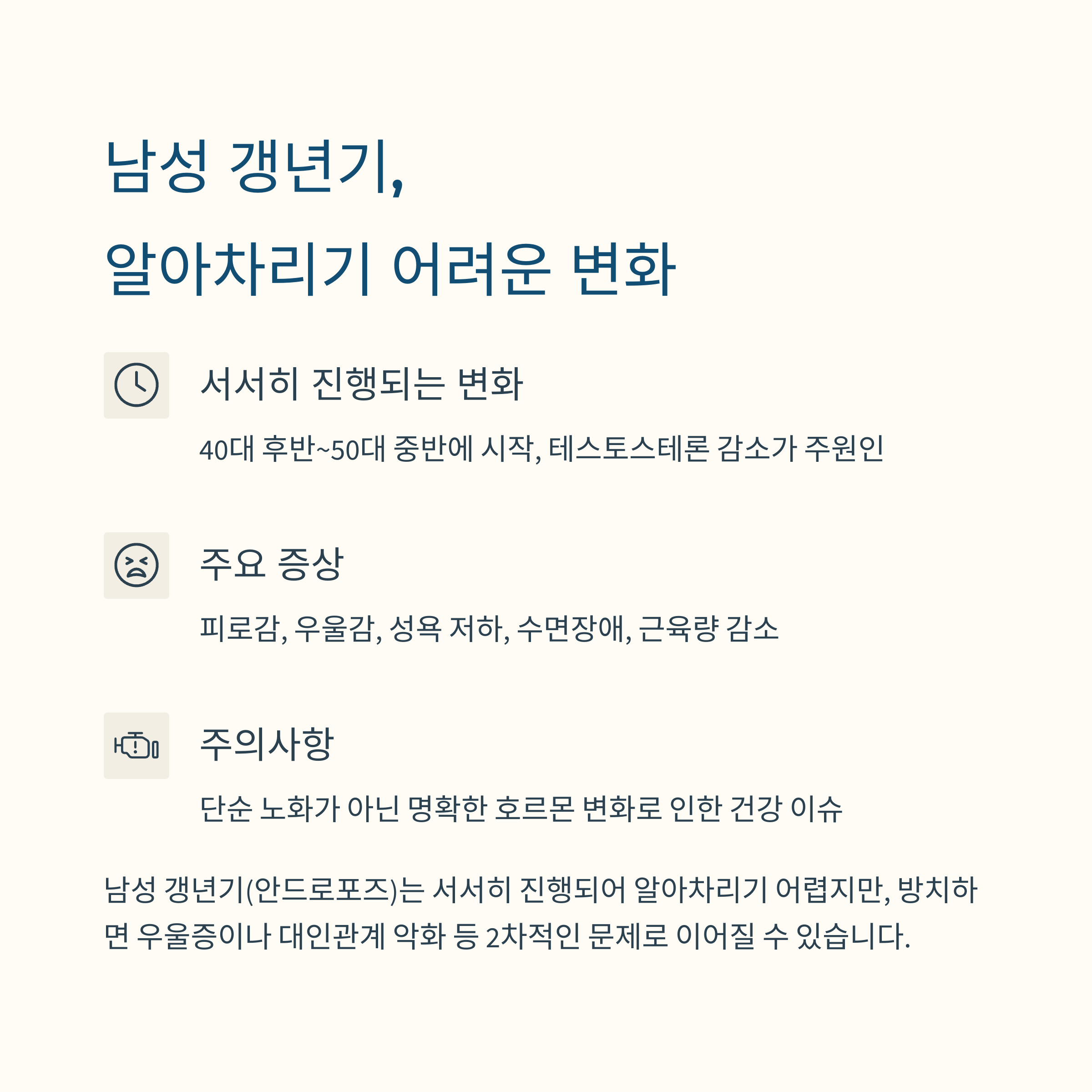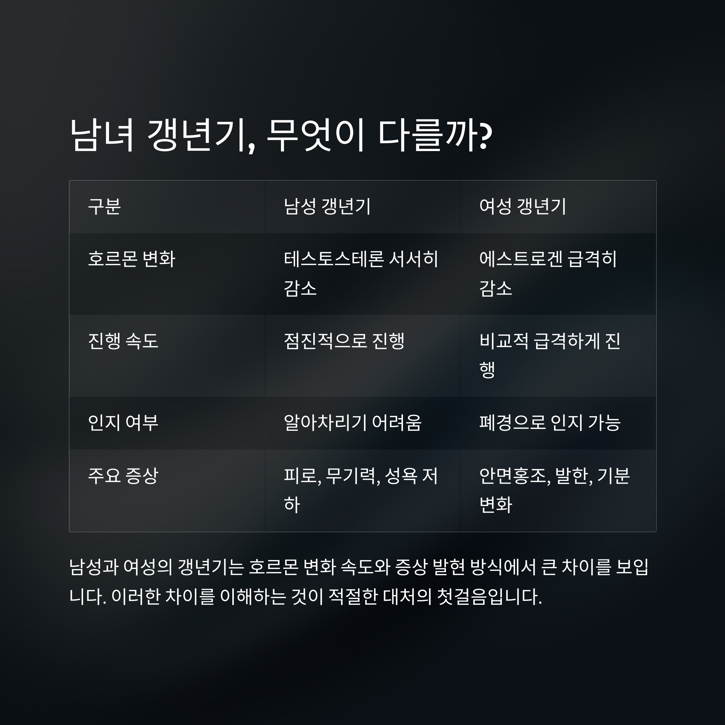 여러분, 혹시 이런 적 있으시죠? 무기력하고 짜증이 늘고, 갑작스런 감정 기복까지… '이게 혹시 갱년기?' 하며 고민해보신 적 있으신가요? 많은 분들이 갱년기는 여성만의 문제라고 오해하시는데요. 사실 남성에게도 갱년기는 찾아옵니다. 그런데 이 둘, 생각보다 꽤나 다르게 나타납니다. 오늘은 남성과 여성 갱년기의 차이를 자세히 비교해보며, 각각 어떻게 관리하면 좋을지 알아보겠습니다.