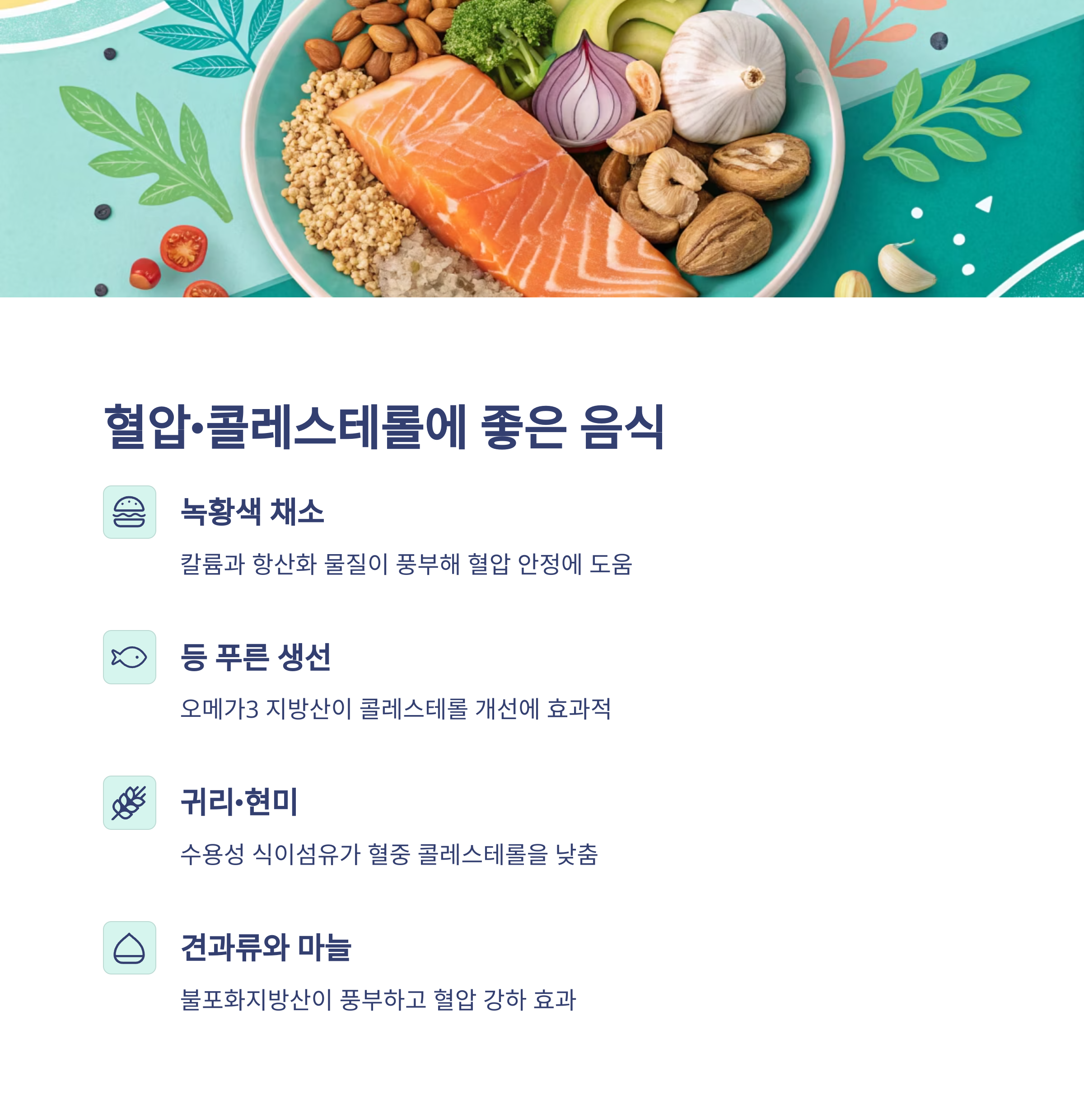건강검진 후 '혈압이 높습니다', '콜레스테롤 수치가 경계입니다'라는 말 한 번쯤 들어보신 적 있으신가요? 약을 복용하기엔 아직 이르고, 자연스럽게 식단 조절로 개선해보고 싶다는 분들이 많습니다. 그렇다면 식단만으로 혈압과 콜레스테롤을 정말 관리할 수 있을까요? 오늘은 이 질문에 대한 과학적 답과 실천 방법을 함께 알아보겠습니다.