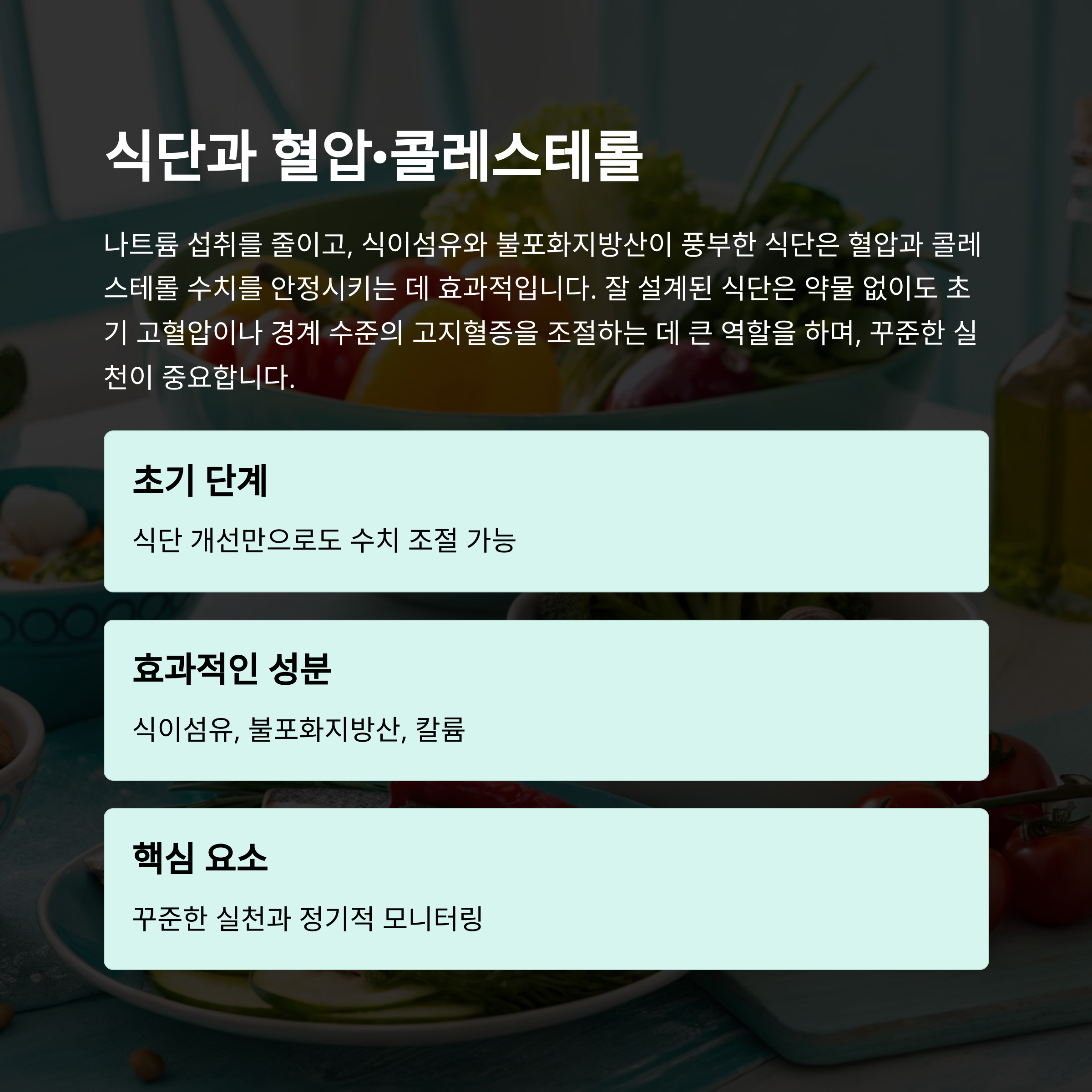 혈압과 콜레스테롤은 약물 외에도 식단을 통해 충분히 조절 가능한 경우가 많습니다. 특히 초기 단계에서의 식단 개선은 장기적으로 약물 복용을 피하거나 줄일 수 있는 좋은 방법이에요. 단, 수치가 일정 수준을 넘거나 위험 인자가 있는 경우엔 전문가와의 상담을 병행해야 해요.