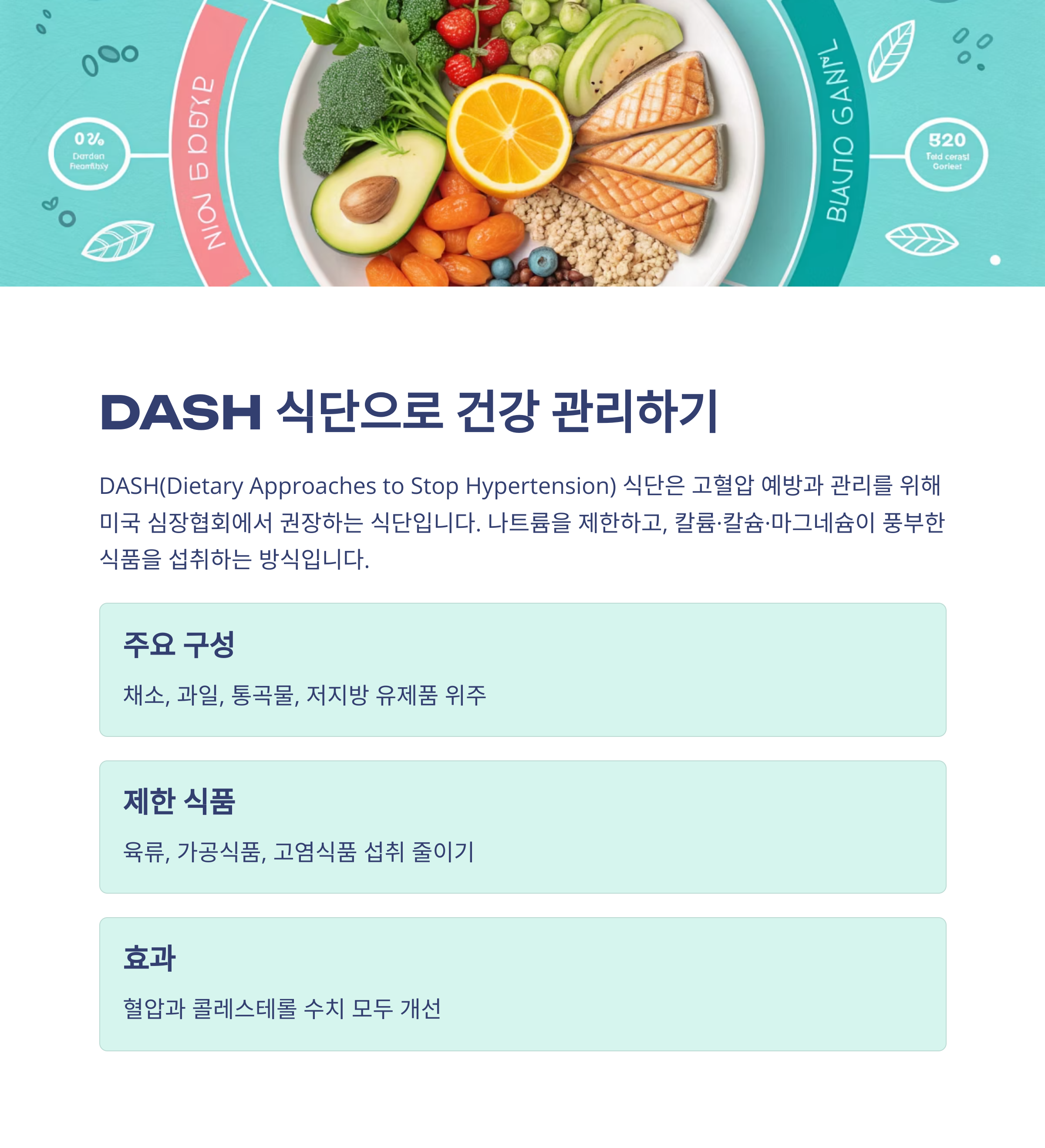혈압관리, 콜레스테롤식단, 고혈압식사, DASH식단, 저염식, 식습관개선