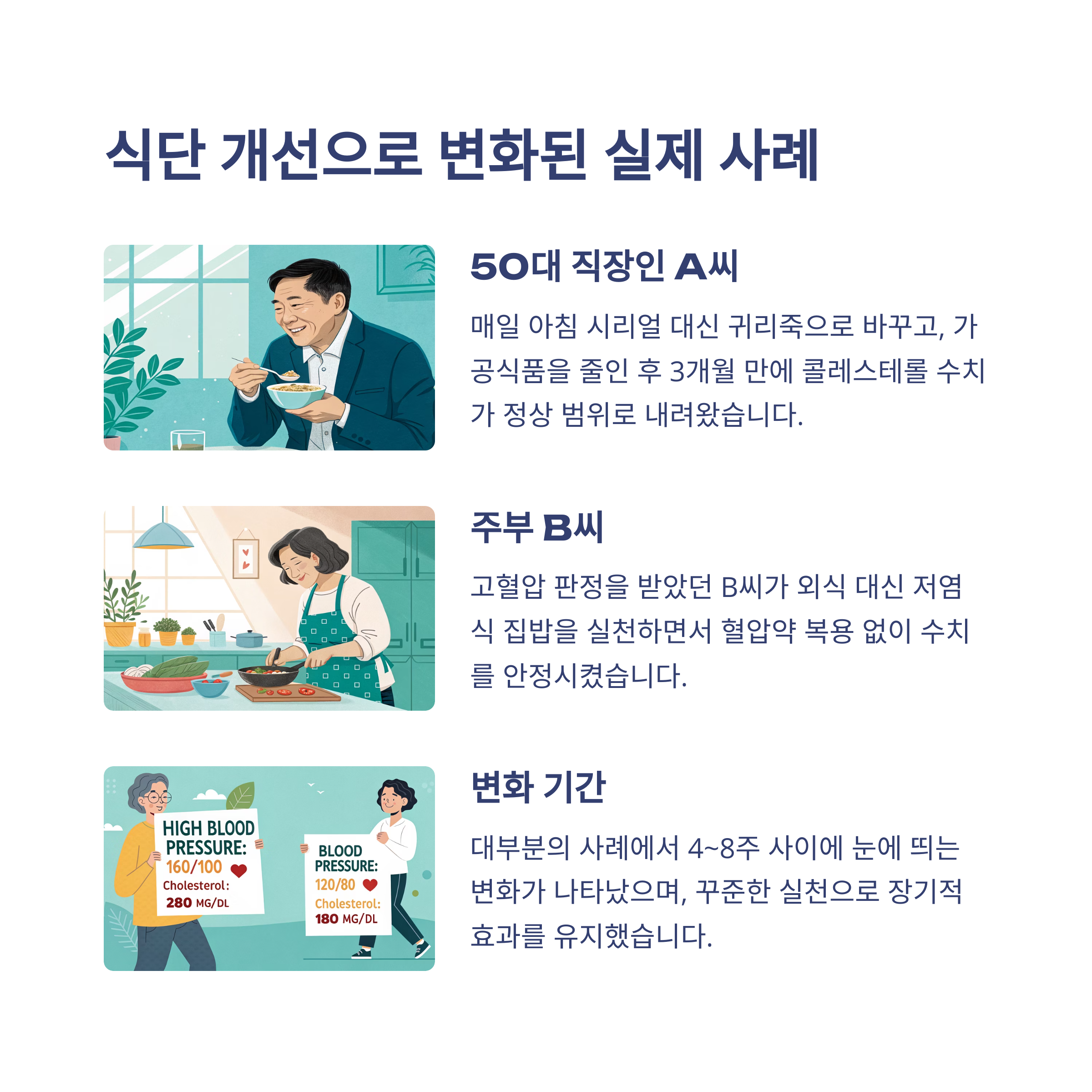50대 중반 직장인 A씨는 매일 아침 시리얼 대신 귀리죽으로 바꾸고, 가공식품을 줄인 후 3개월 만에 콜레스테롤 수치가 정상 범위로 내려왔습니다. 또 다른 사례로는 고혈압 판정을 받았던 주부 B씨가 외식 대신 저염식 집밥을 실천하면서 혈압약 복용 없이 수치를 안정시킨 경우도 있었습니다. 식단 개선이 실질적인 변화를 만드는 대표적인 예입니다.