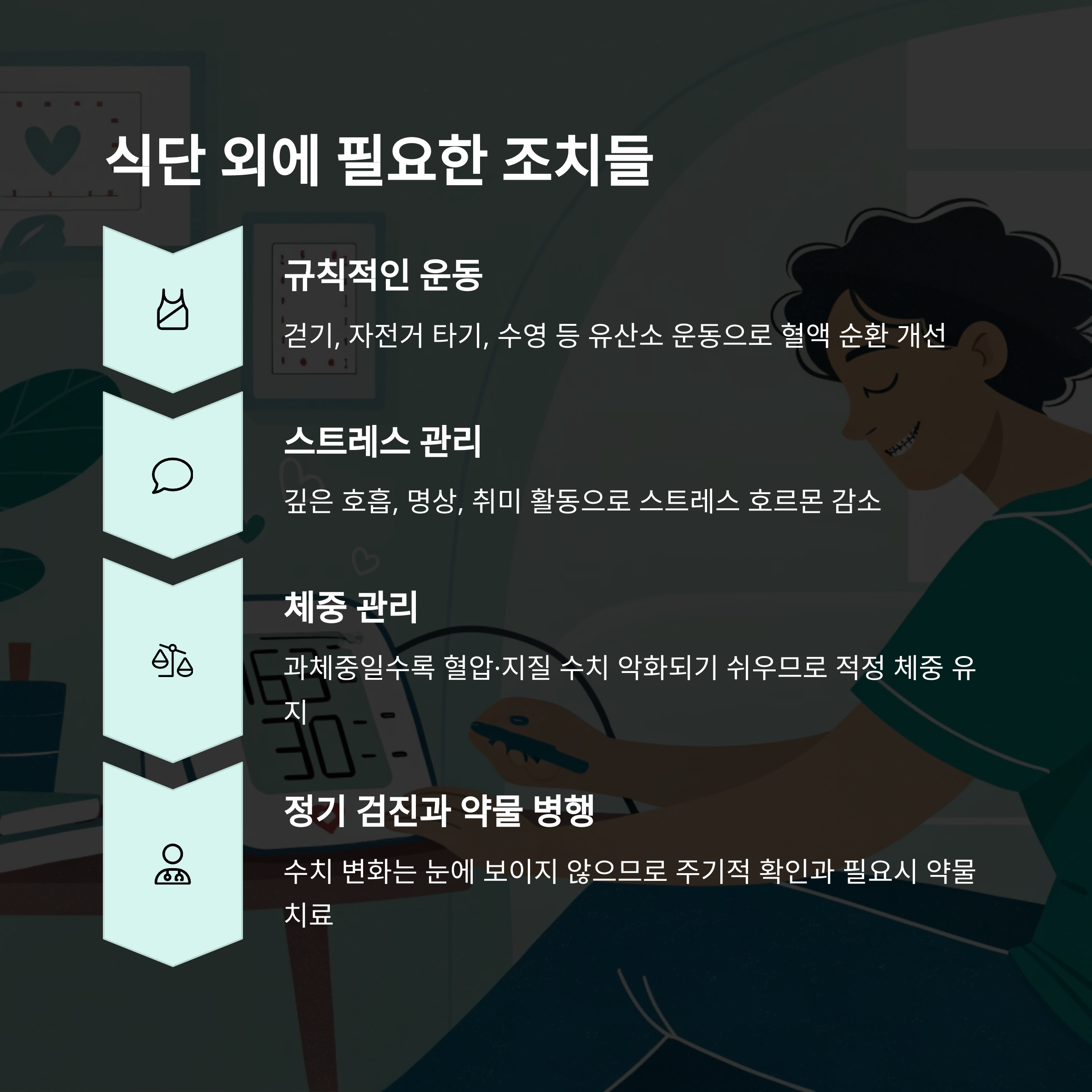 • 체중 관리 – 과체중일수록 혈압·지질 수치 악화되기 쉬워요