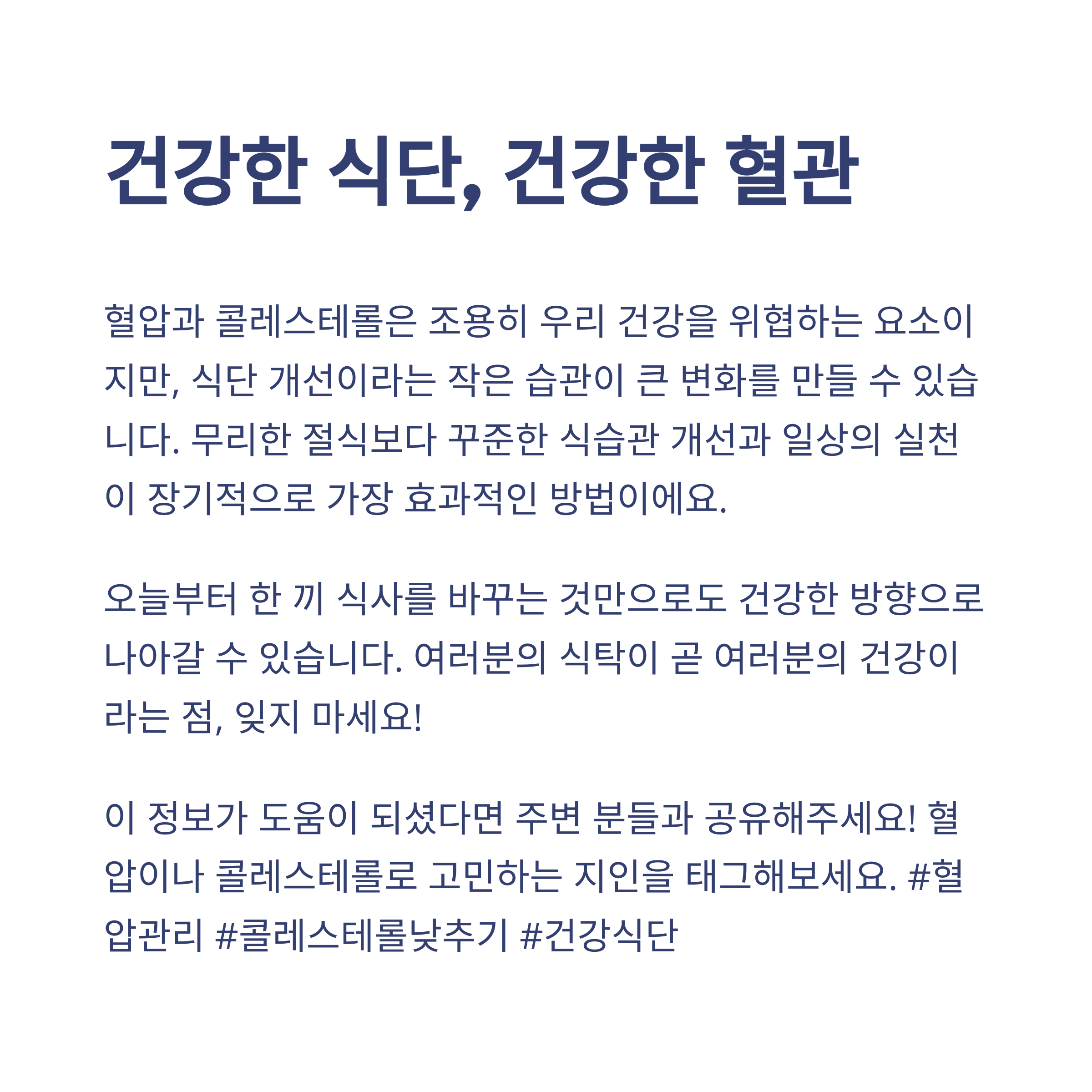 혈압과 콜레스테롤은 조용히 우리 건강을 위협하는 요소이지만, 식단 개선이라는 작은 습관이 큰 변화를 만들 수 있습니다. 무리한 절식보다 꾸준한 식습관 개선과 일상의 실천이 장기적으로 가장 효과적인 방법이에요. 오늘부터 한 끼 식사를 바꾸는 것만으로도 건강한 방향으로 나아갈 수 있습니다. 여러분의 식탁이 곧 여러분의 건강이라는 점, 잊지 마세요. 다음 콘텐츠에서도 더 좋은 정보로 찾아오겠습니다!