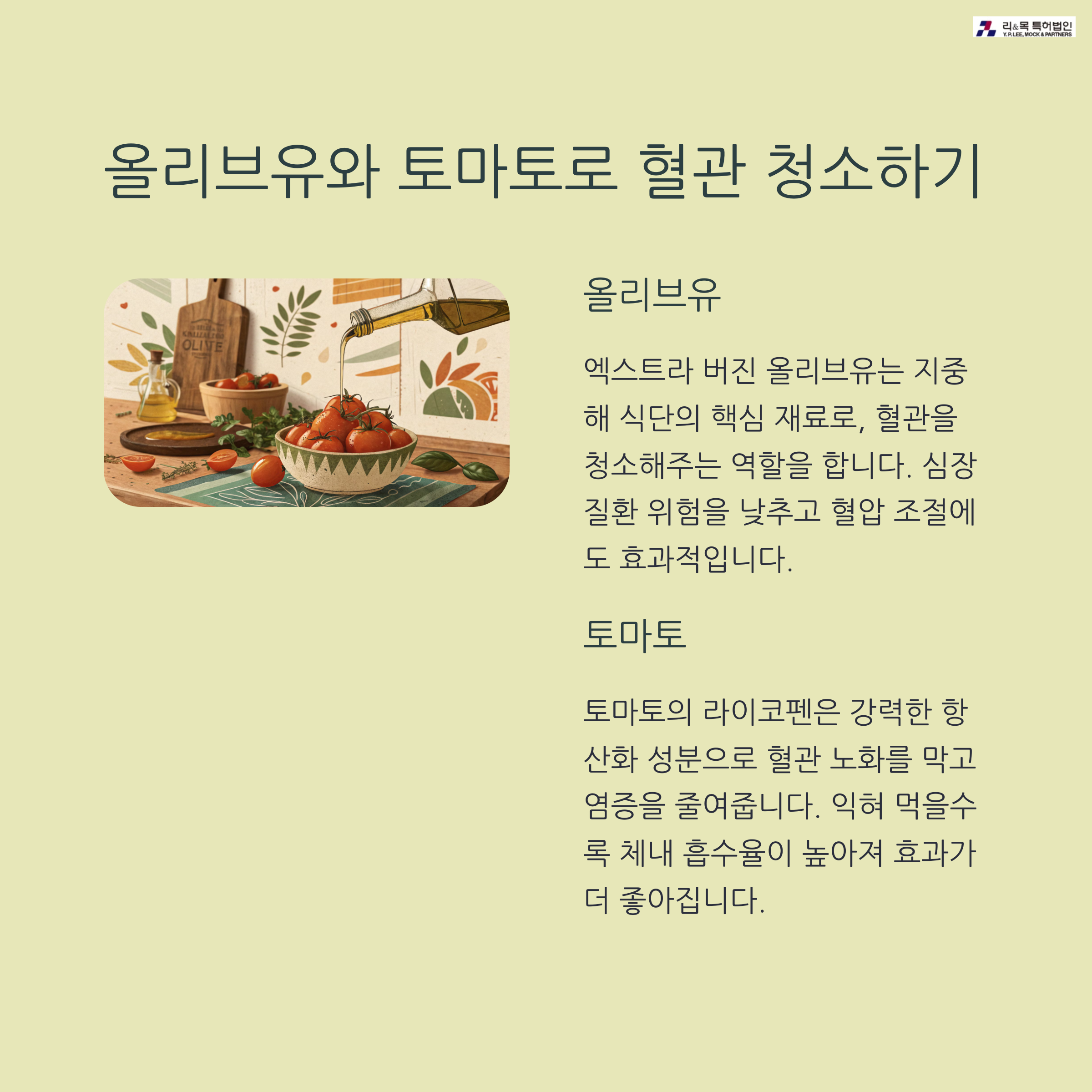엑스트라 버진 올리브유는 지중해 식단의 핵심 재료로, 혈관을 청소해주는 역할을 해요. 심장질환 위험을 낮추고 혈압 조절에도 효과가 있으며, 샐러드 드레싱이나 생채소와 함께 섭취하면 좋습니다.