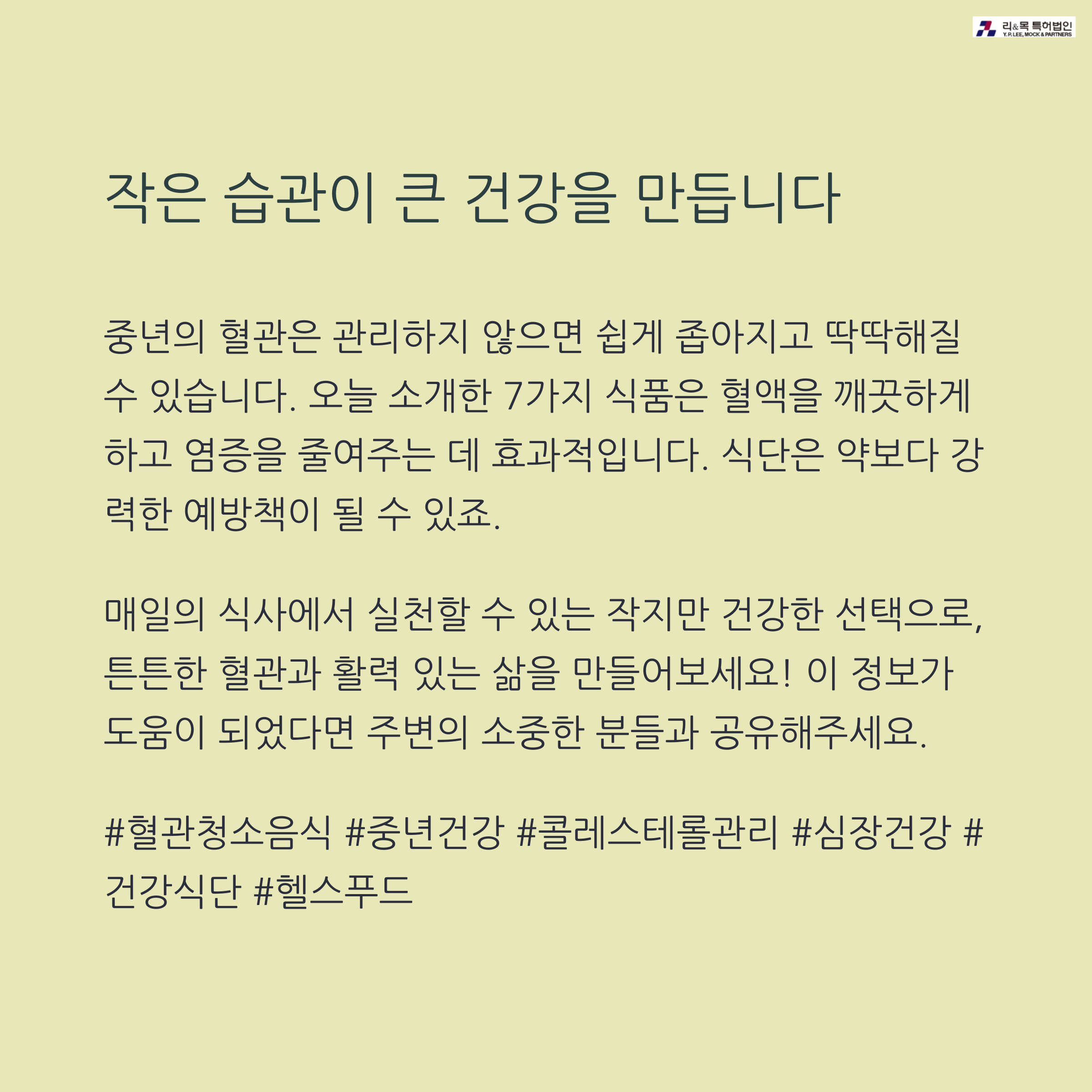 혈관 건강은 중년 이후 전반적인 건강 상태를 결정짓는 중요한 요소입니다. 오늘 소개한 7가지 식품은 모두 혈액순환과 염증 완화, 콜레스테롤 관리에 효과적인 음식들이에요. 매일의 식탁에 조금씩 추가해보세요. 작은 습관이 큰 건강을 만들어냅니다.