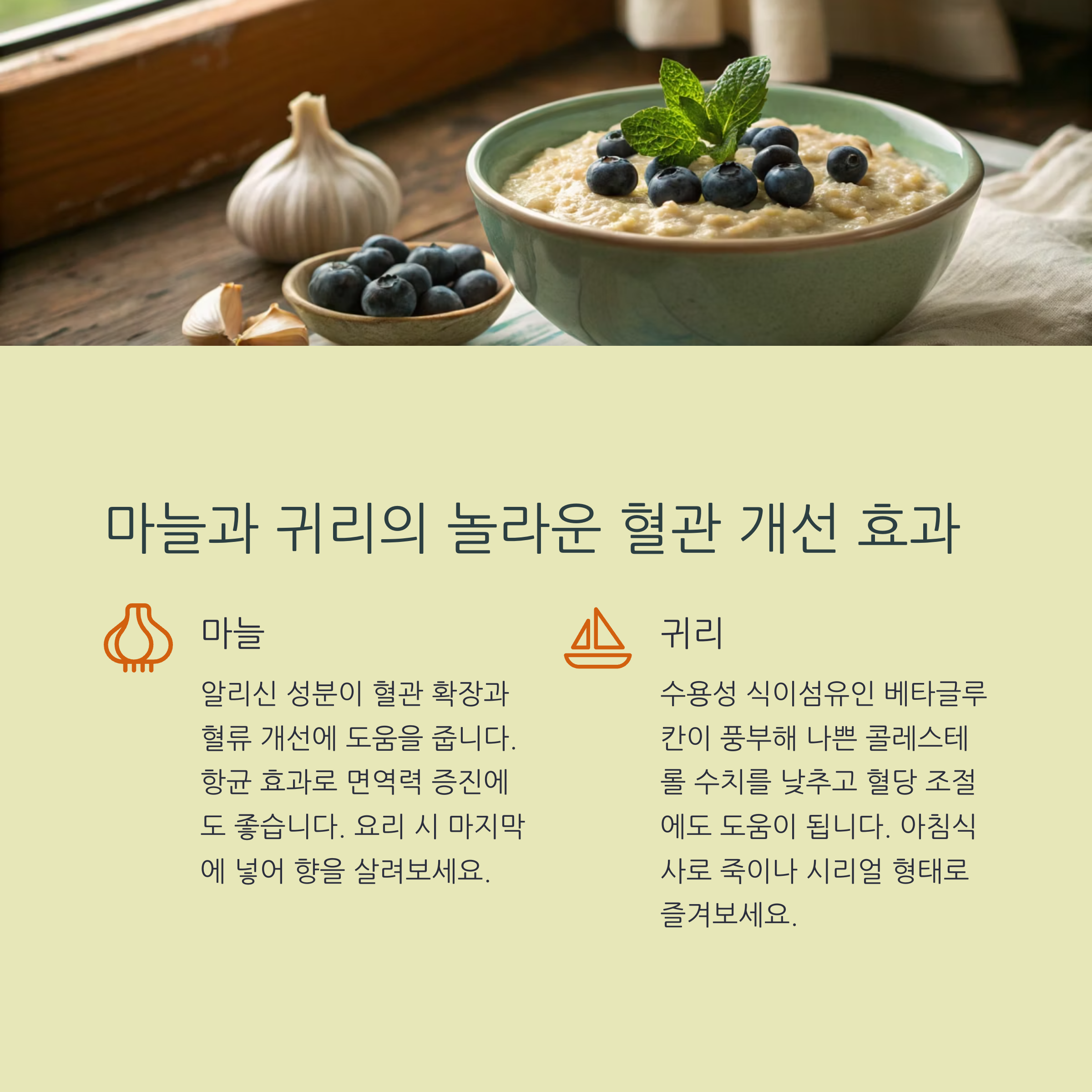마늘 속 알리신 성분은 혈관 확장과 혈류 개선에 도움을 줍니다. 항균 효과까지 있어 면역력 증진에도 좋으며, 생으로 먹기 부담스럽다면 요리 시 마지막에 넣어 향을 살려보세요.
