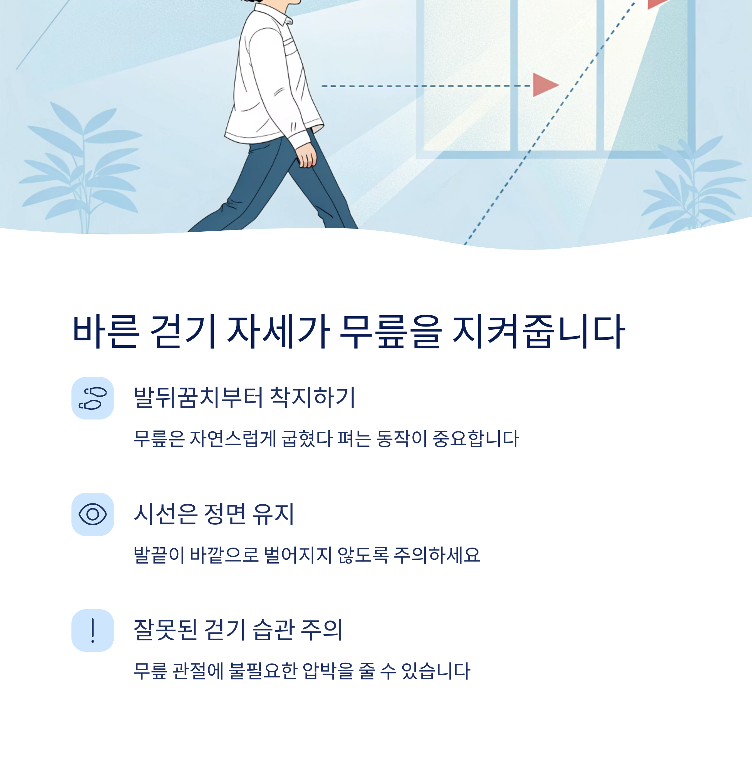 무릎통증예방, 걷기자세, 관절강화운동, 계단주의, 무릎관리, 쿠션신발