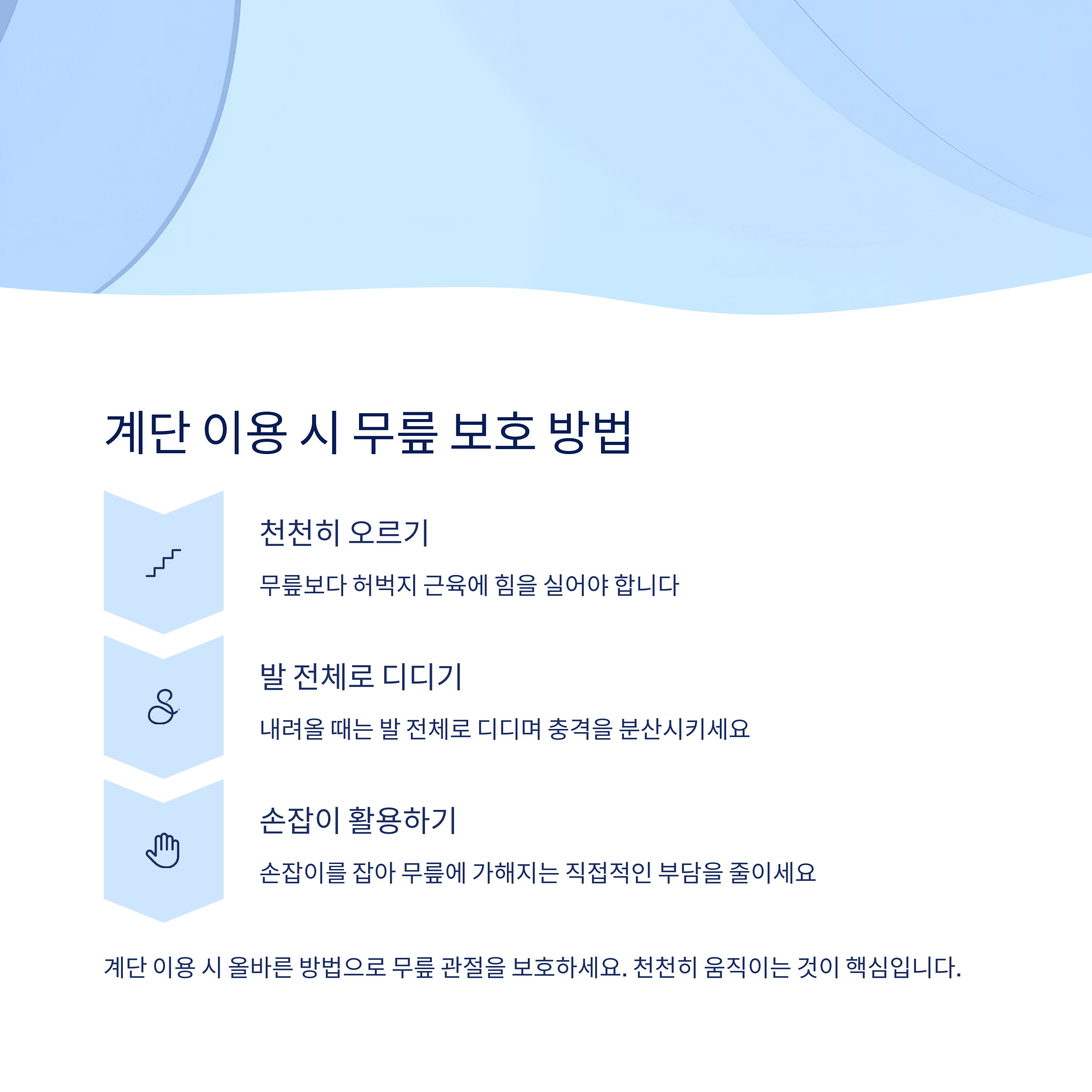 계단을 오를 때는 천천히, 무릎보다 허벅지 근육에 힘을 실어야 합니다. 내려올 때는 발 전체로 디디며, 손잡이를 활용해 충격을 줄이세요. 무릎에 직접적인 부담을 피하는 것이 핵심입니다.
