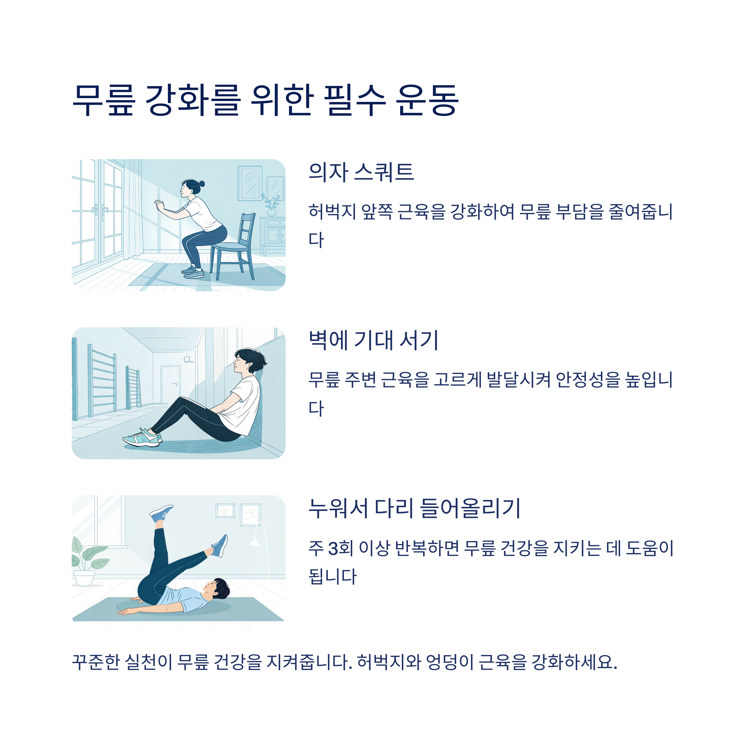 허벅지 앞쪽과 엉덩이 근육을 강화하면 무릎 부담을 줄일 수 있어요. 의자 스쿼트, 벽에 기대 서기, 누워서 다리 들어올리기 등을 주 3회 이상 반복해보세요. 꾸준한 실천이 무릎 건강을 지켜줍니다.