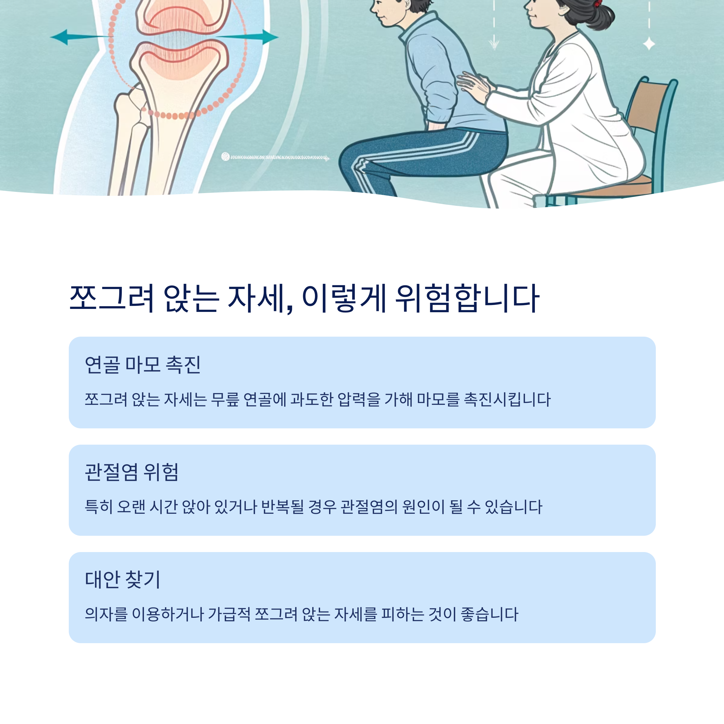 쪼그려 앉는 자세는 무릎 연골에 과도한 압력을 가해 마모를 촉진시켜요. 특히 오랜 시간 앉아 있거나 반복될 경우 관절염의 원인이 될 수 있으니 의자를 이용하거나 가급적 피하는 것이 좋습니다.