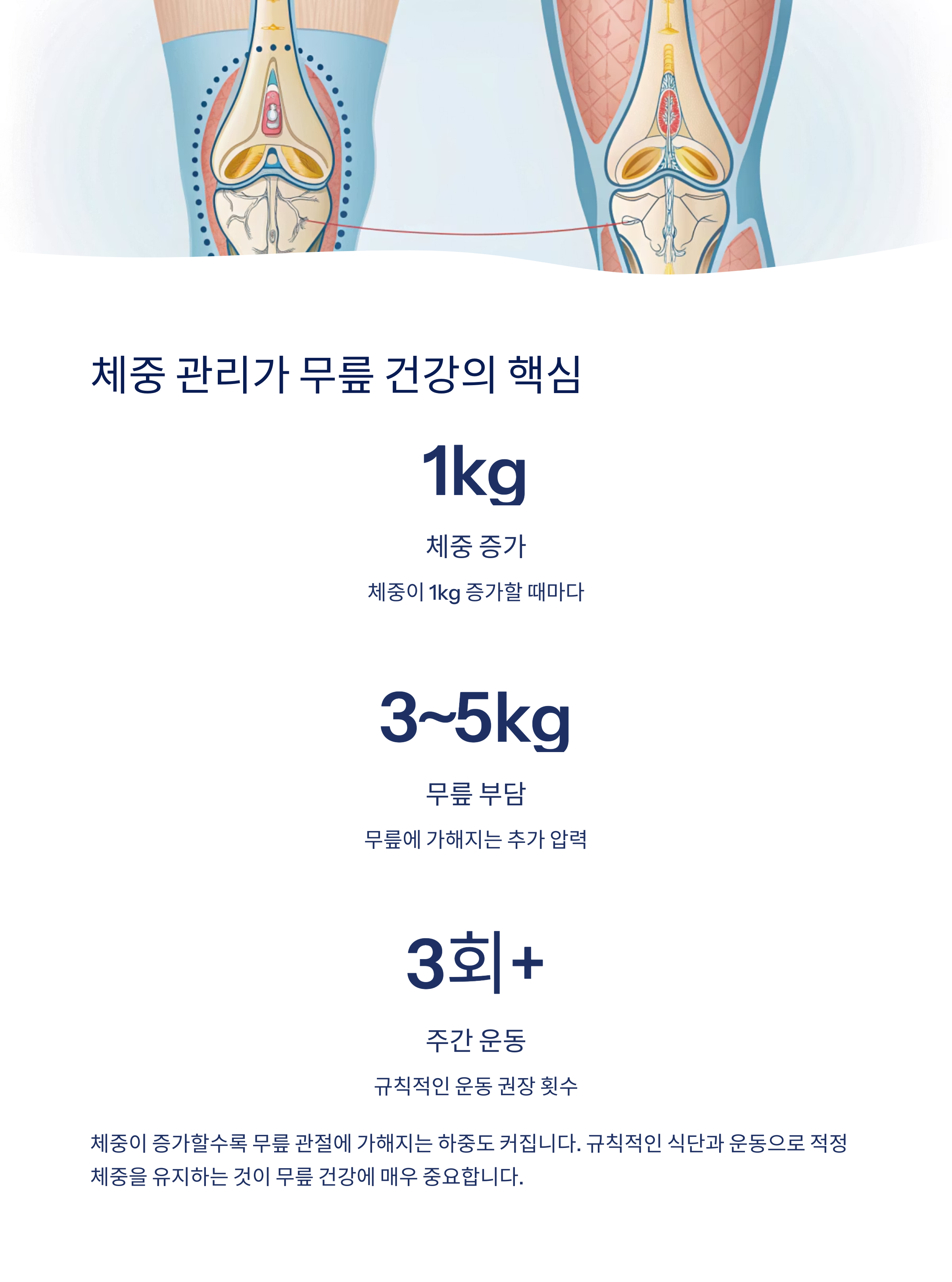 체중이 증가할수록 무릎 관절에 가해지는 하중도 커집니다. 1kg이 늘면 무릎에는 3~5kg의 추가 압력이 전달돼요. 규칙적인 식단과 운동으로 적정 체중을 유지하는 것이 중요합니다.