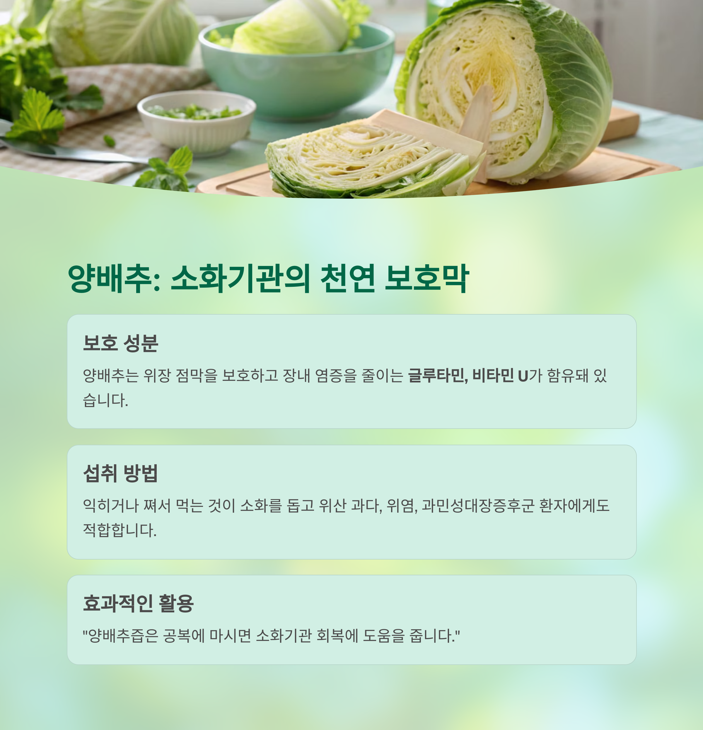 "양배추즙은 공복에 마시면 소화기관 회복에 도움을 줍니다."
