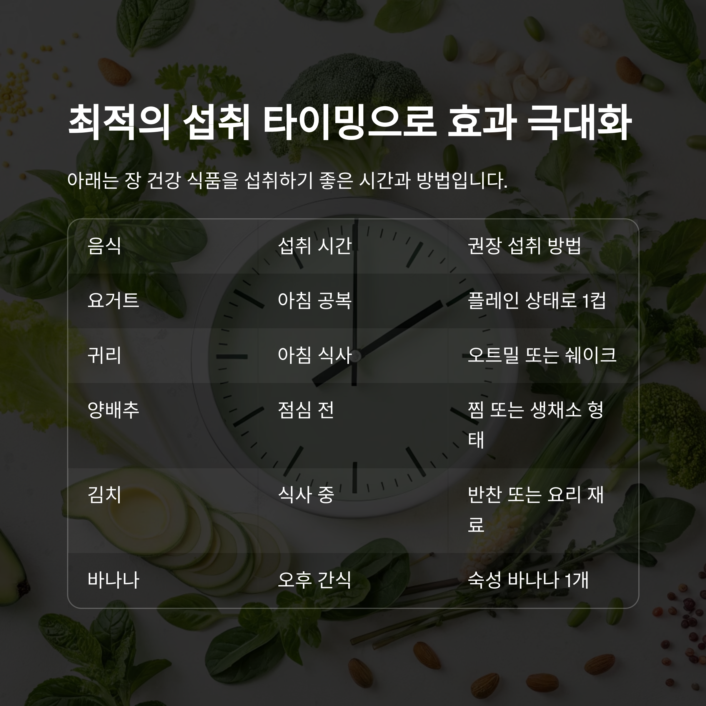 아래는 장 건강 식품을 섭취하기 좋은 시간과 방법입니다.