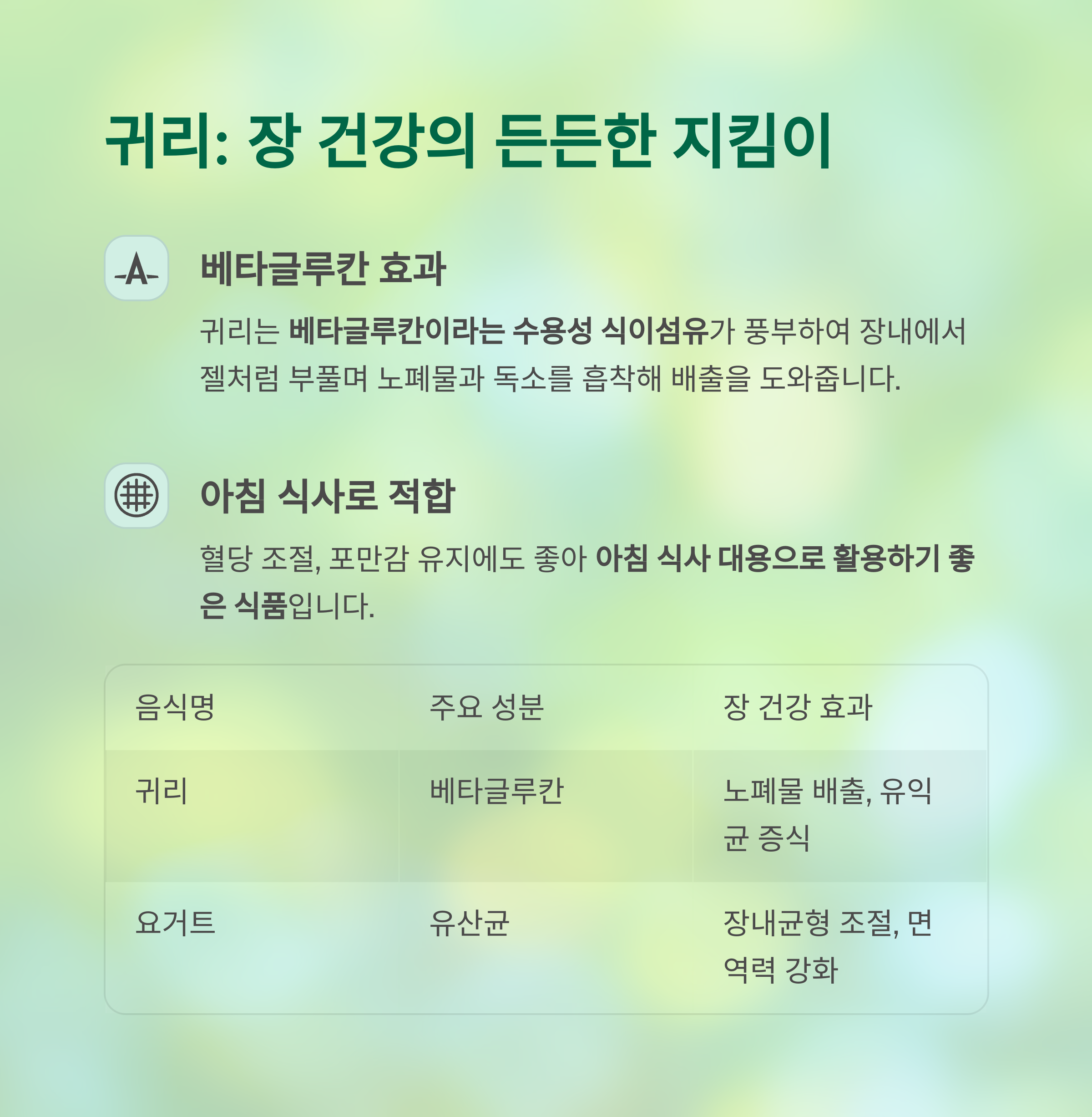 | 귀리 | 베타글루칸 | 노폐물 배출, 유익균 증식 |