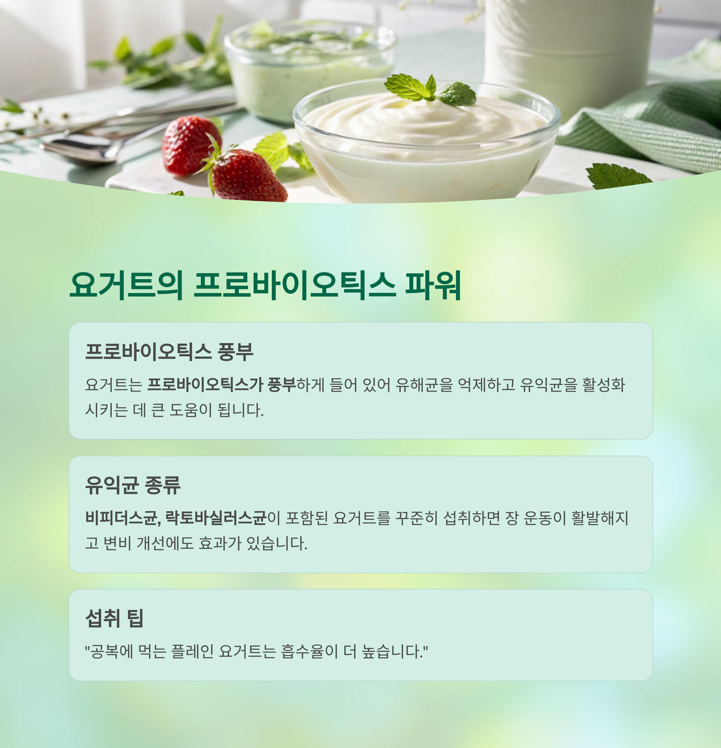 | 요거트 | 유산균 | 장내균형 조절, 면역력 강화 |