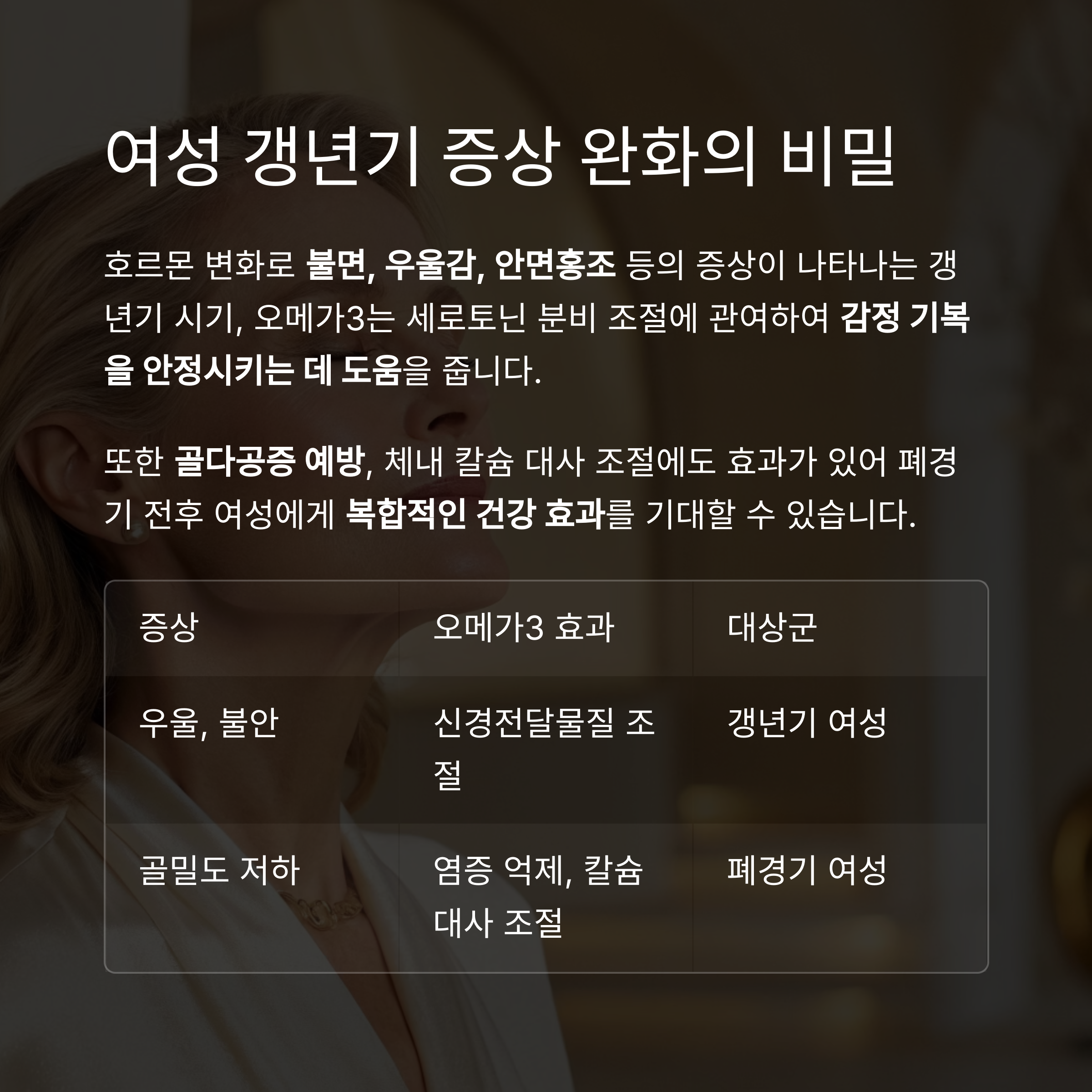 | 골밀도 저하 | 염증 억제, 칼슘 대사 조절 | 폐경기 여성 |