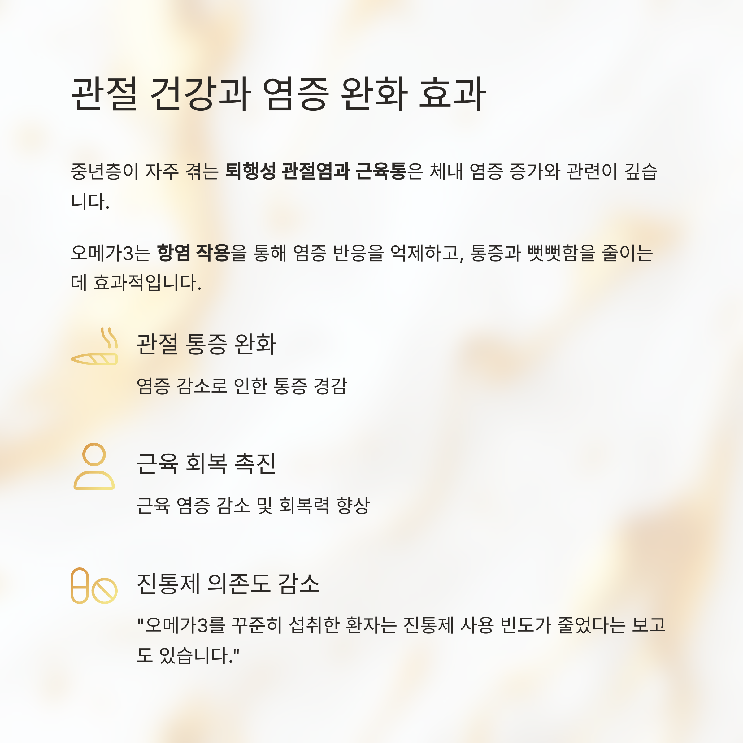 "특히 오메가3를 꾸준히 섭취한 환자는 진통제 사용 빈도가 줄었다는 보고도 있습니다."