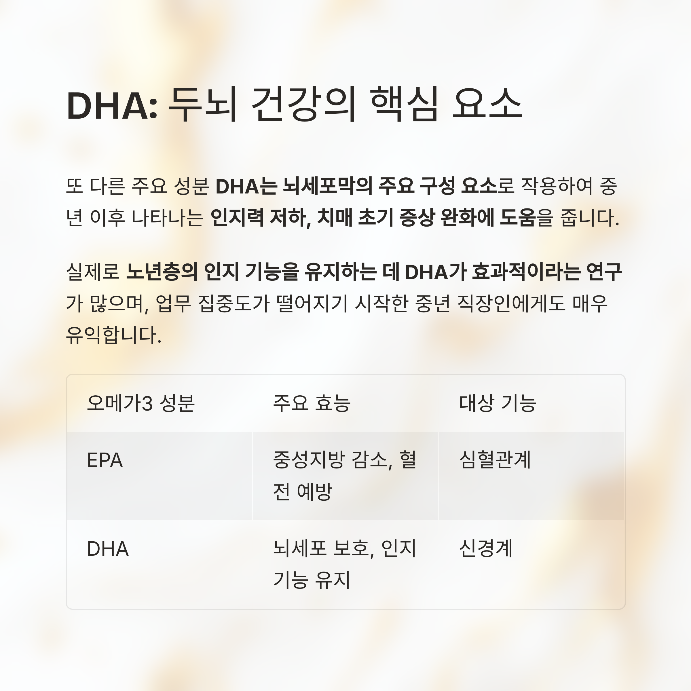 | DHA | 뇌세포 보호, 인지기능 유지 | 신경계 |