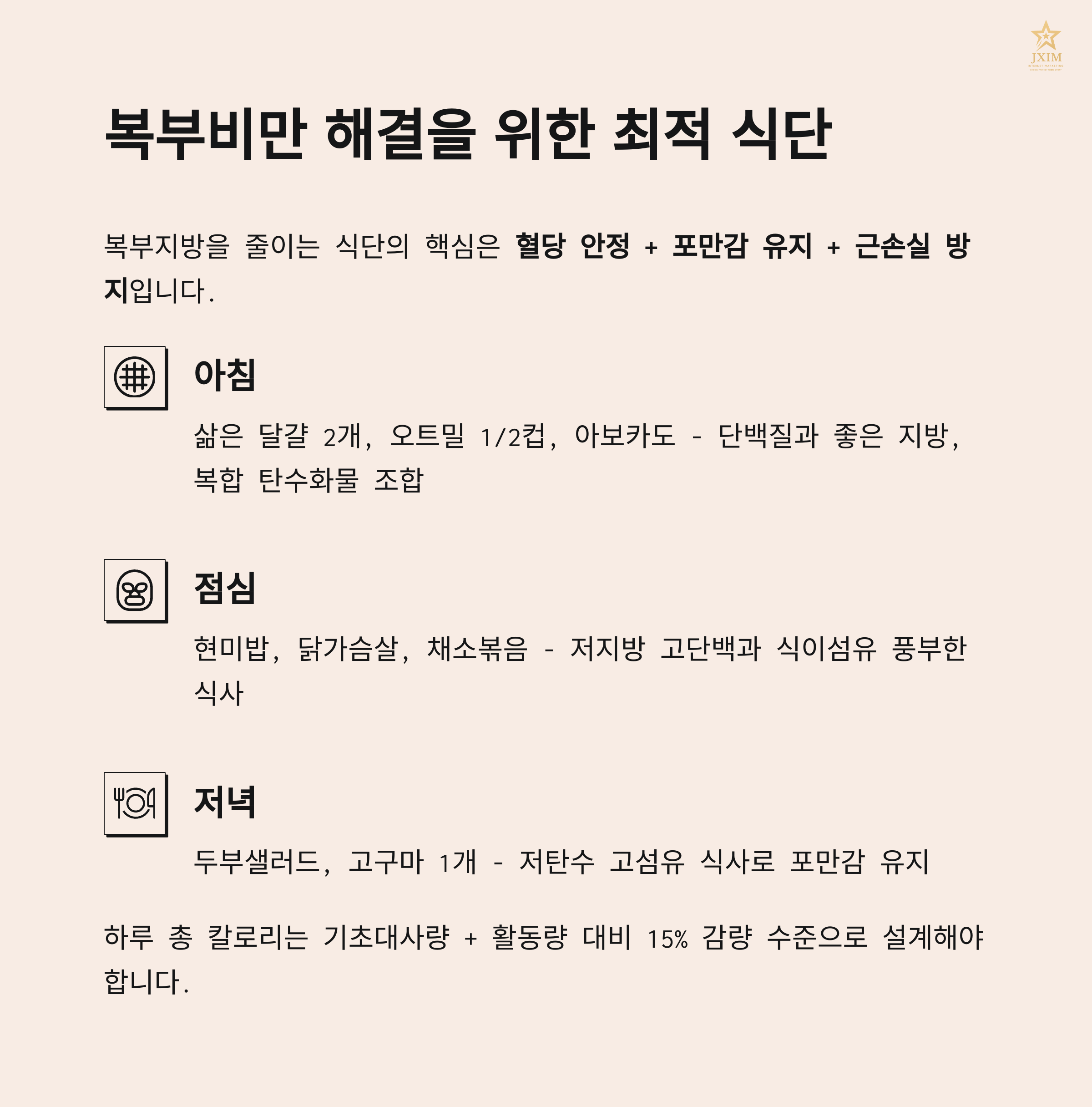 복부지방을 줄이는 식단의 핵심은 혈당 안정 + 포만감 유지 + 근손실 방지입니다.
