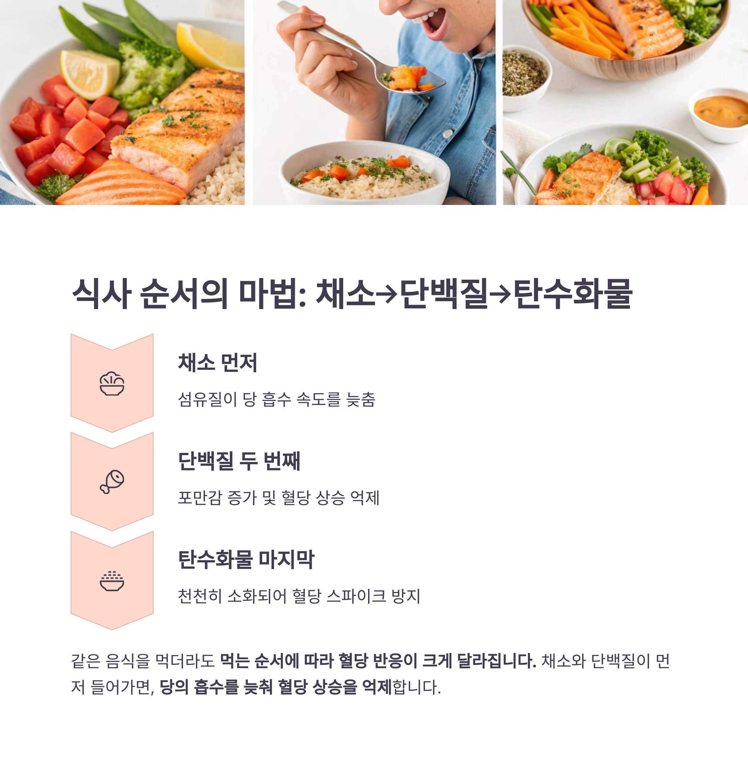 같은 음식을 먹더라도 먹는 순서에 따라 혈당 반응이 크게 달라집니다.