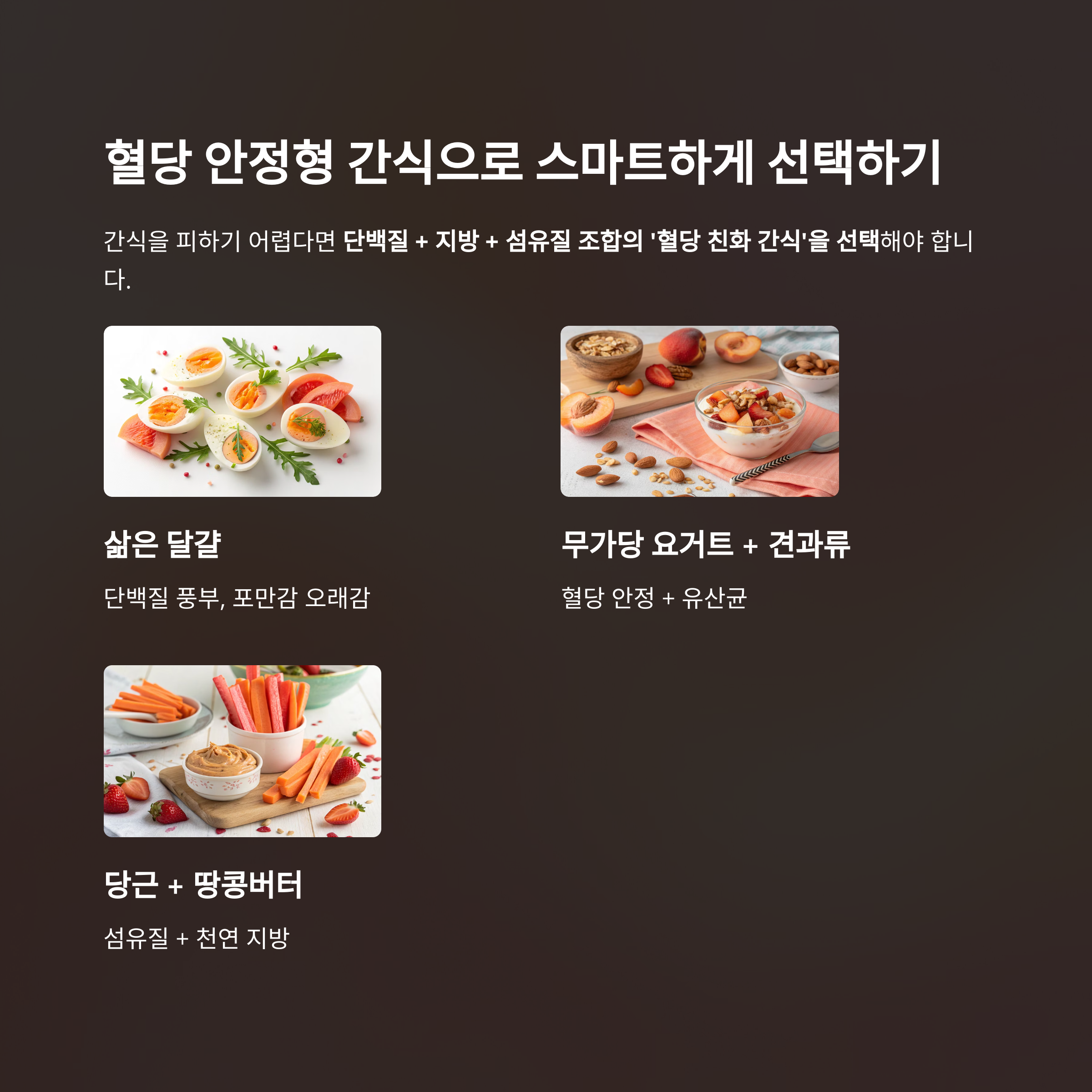 간식을 피하기 어렵다면 단백질 + 지방 + 섬유질 조합의 ‘혈당 친화 간식’을 선택해야 합니다.
