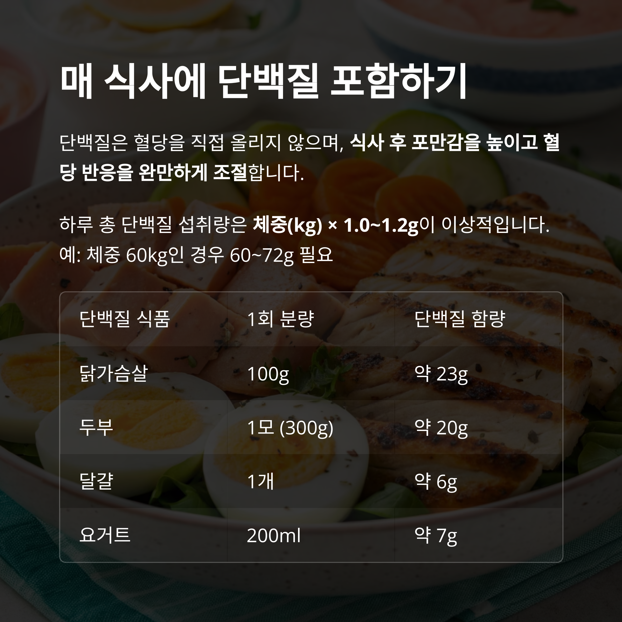 하루 총 단백질 섭취량은 체중(kg) × 1.0~1.2g이 이상적입니다.