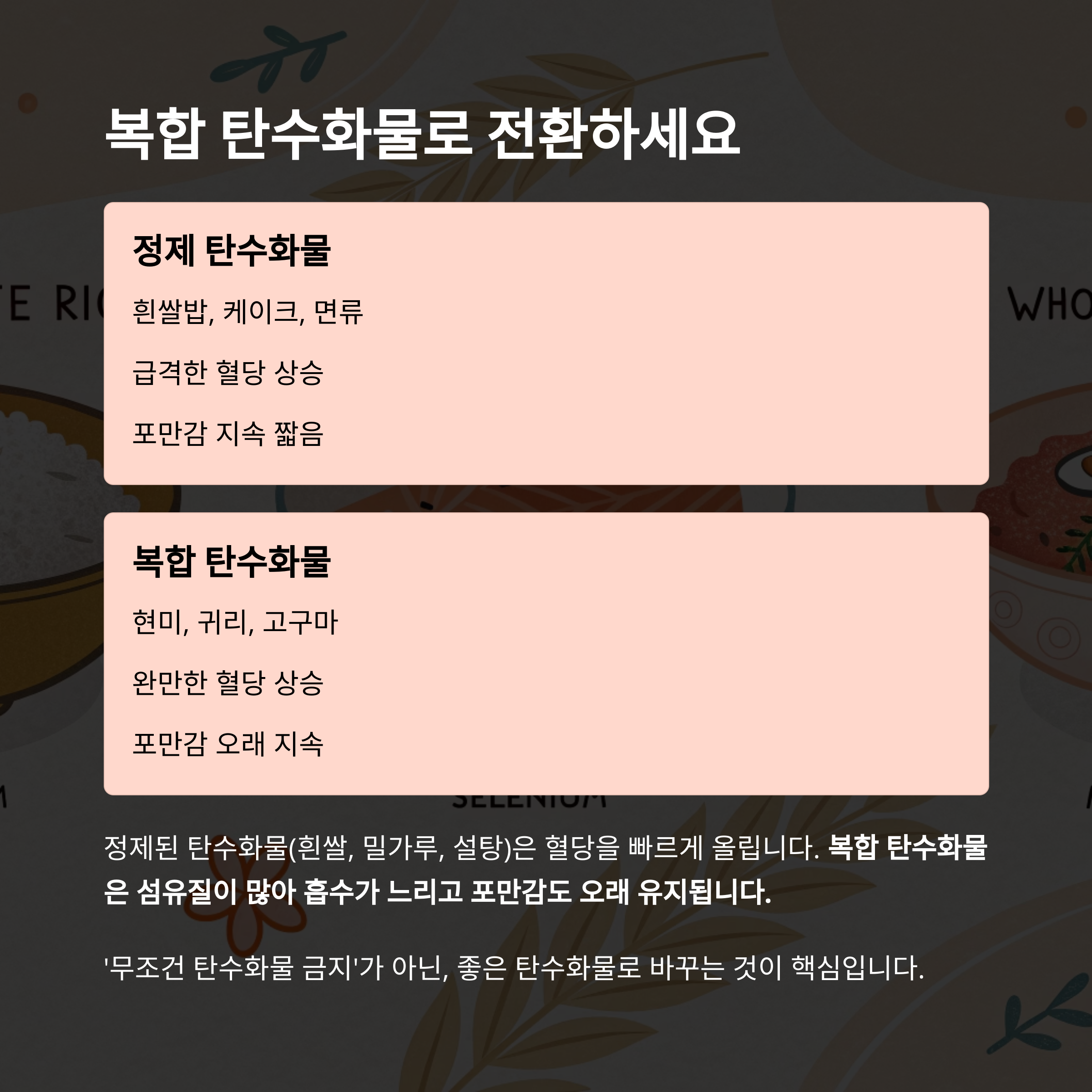 ‘무조건 탄수화물 금지’가 아닌, 좋은 탄수화물로 바꾸는 것이 핵심입니다.