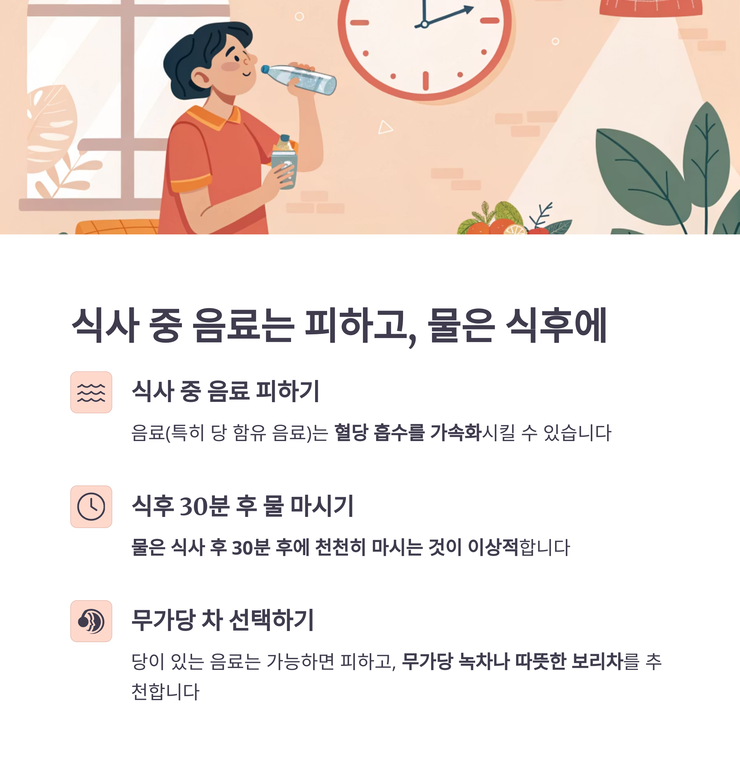 식사 중에 음료(특히 당 함유 음료)를 마시면 혈당 흡수를 가속화시킬 수 있습니다.