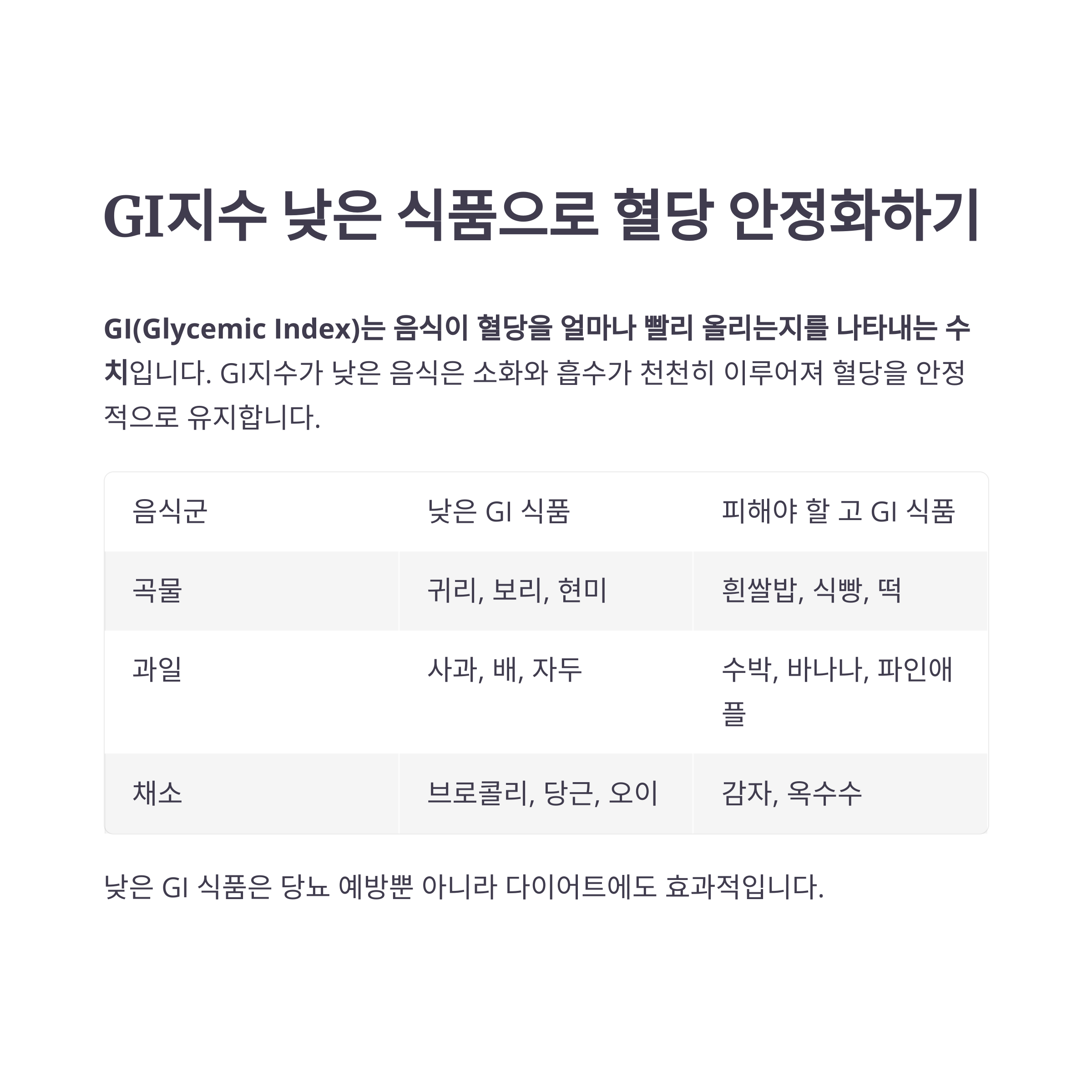 GI지수가 낮은 음식은 소화와 흡수가 천천히 이루어져 혈당을 안정적으로 유지합니다.