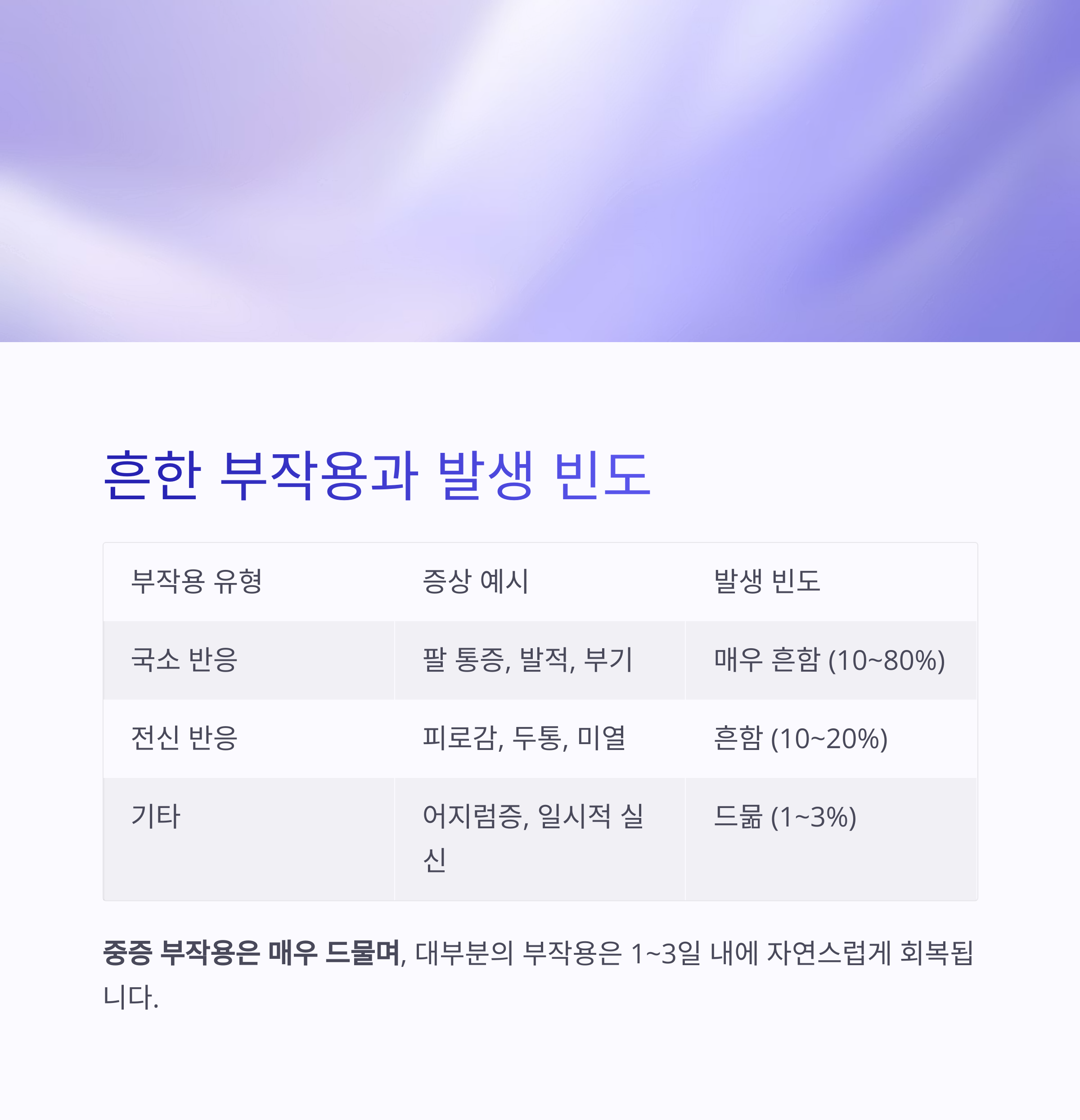 | 전신 반응 | 피로감, 두통, 미열 | 흔함 (10~20%) |