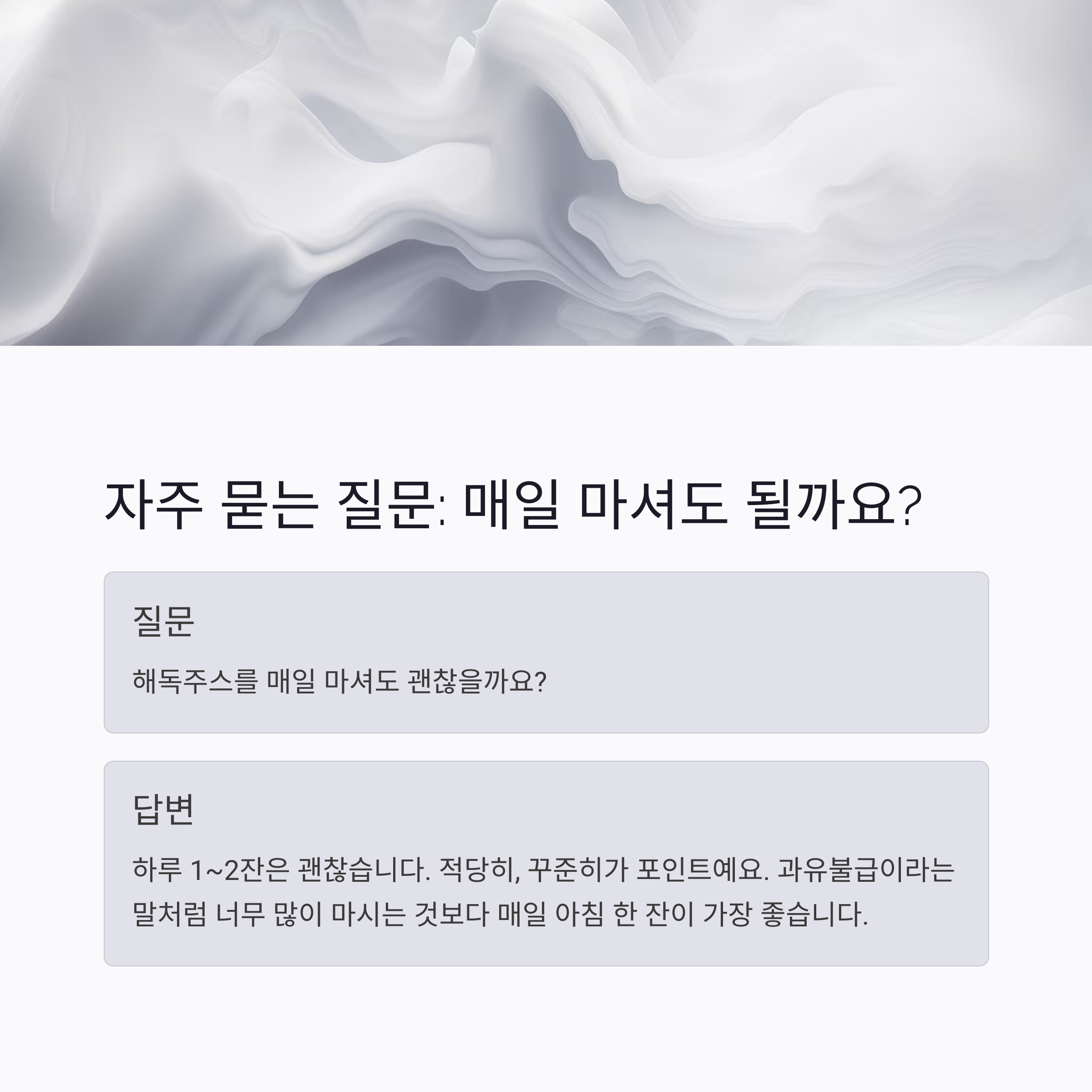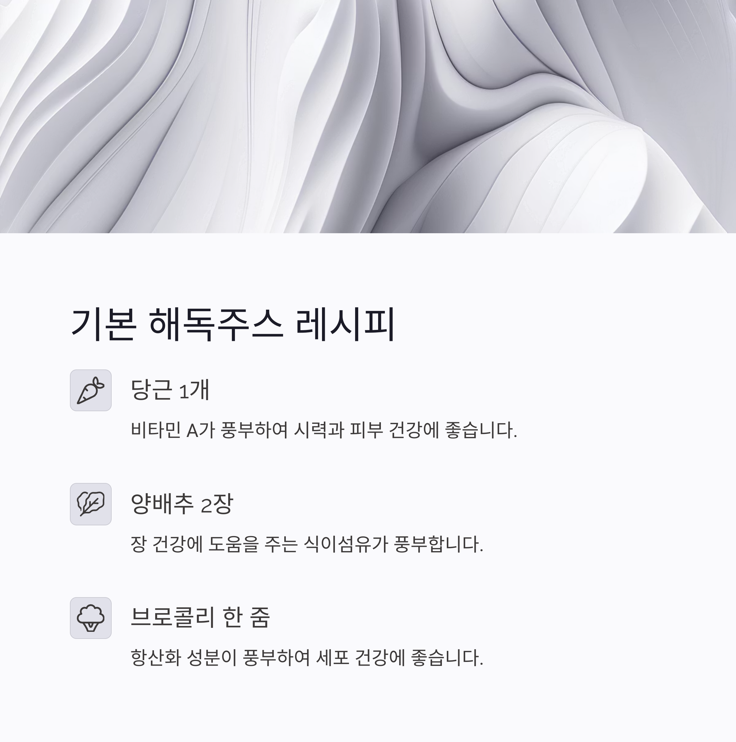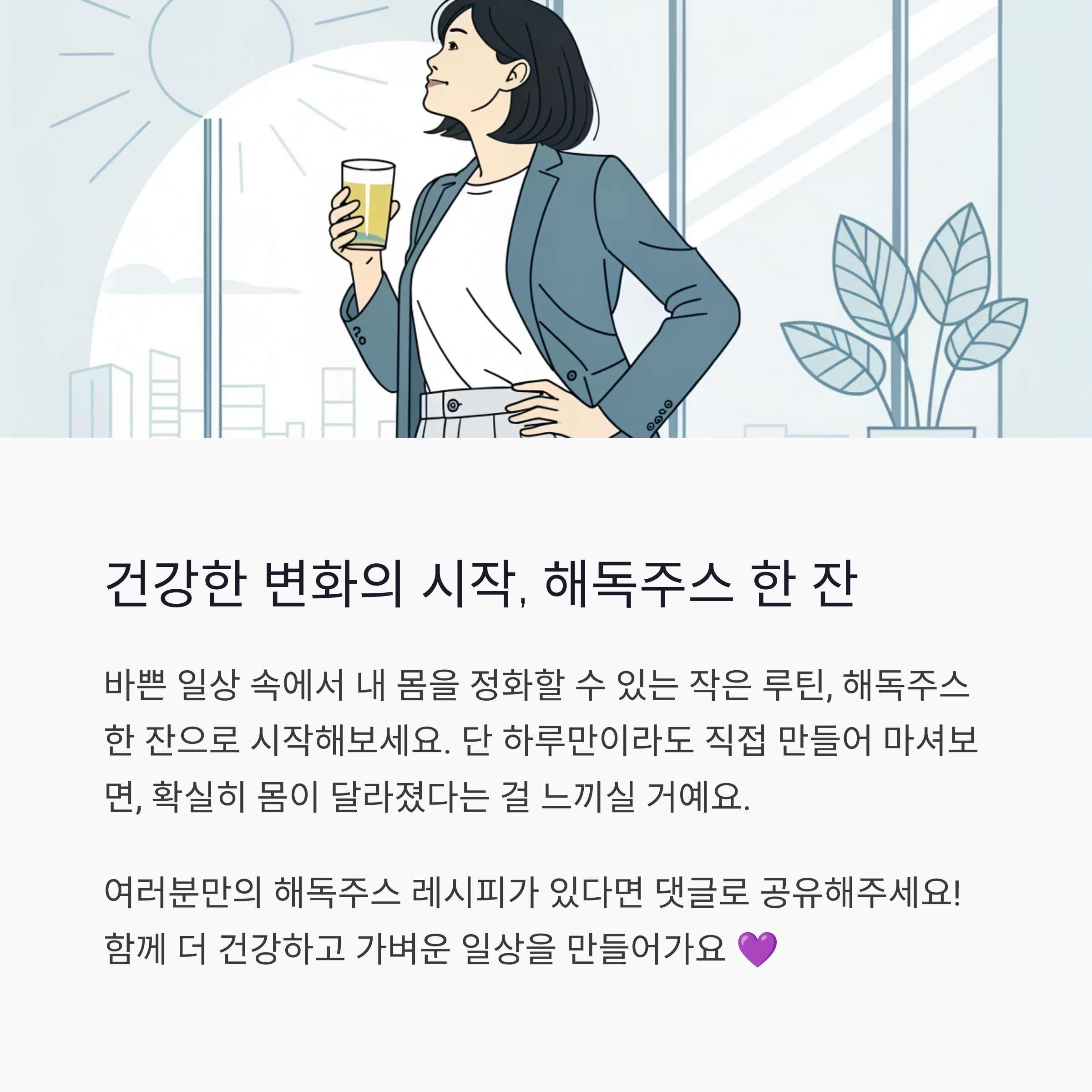 이제 해독주스에 대해 조금은 감이 오셨나요? 복잡할 것 같지만 사실은 굉장히 간단하면서도 효과적인 방법이에요. 바쁜 일상 속에서 내 몸을 정화할 수 있는 작은 루틴, 해독주스 한 잔으로 시작해보세요. 단 하루만이라도 직접 만들어 마셔보면, 확실히 몸이 달라졌다는 걸 느끼실 거예요. 혹시라도 궁금한 점이나 본인만의 조합이 있다면 댓글로 꼭 공유해 주세요! 우리 함께 더 건강하고 가벼운 일상을 만들어가요 💜