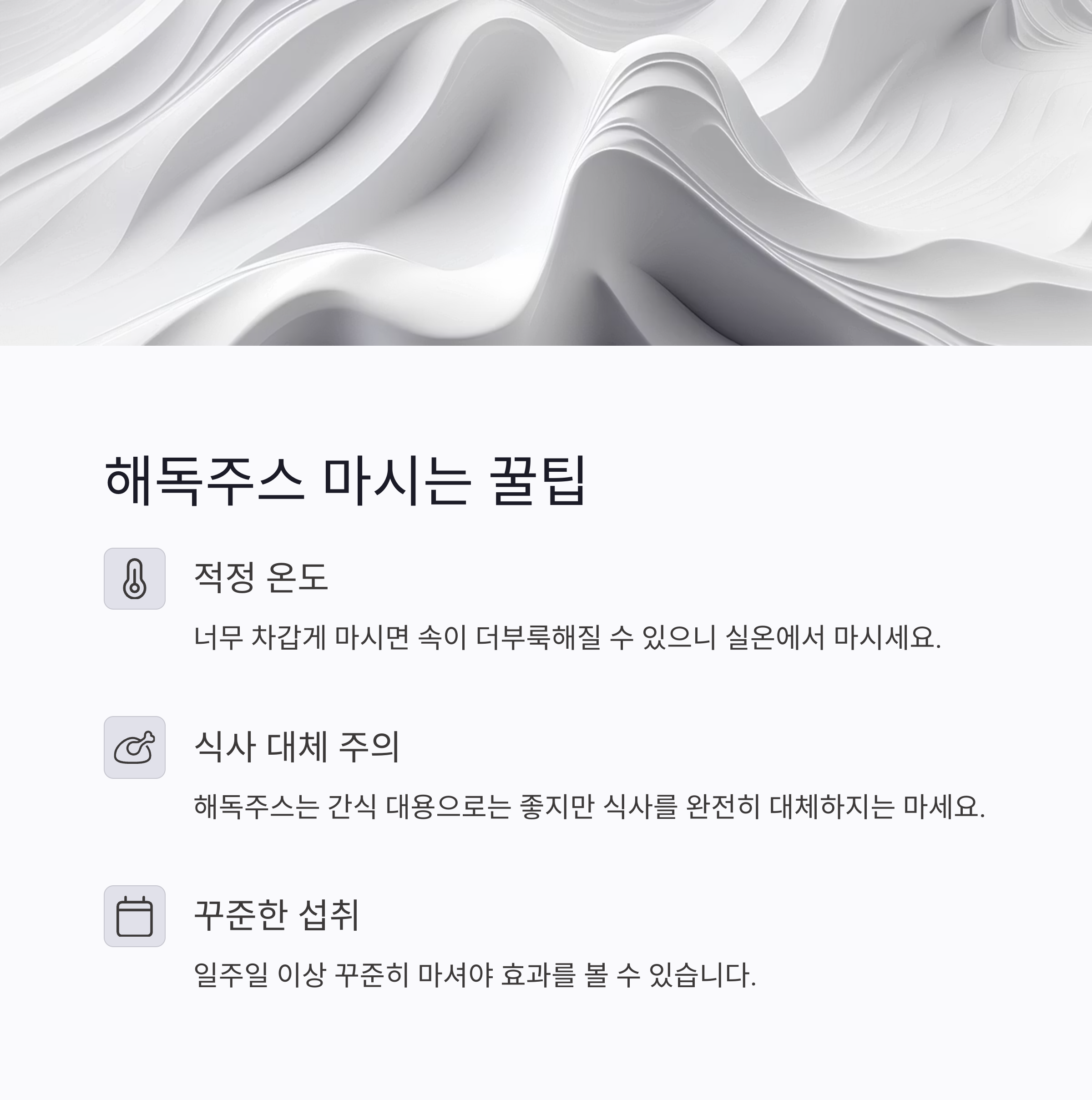 - 꾸준히 마시는 것이 핵심! 일주일 이상 꾸준히 실천해보기