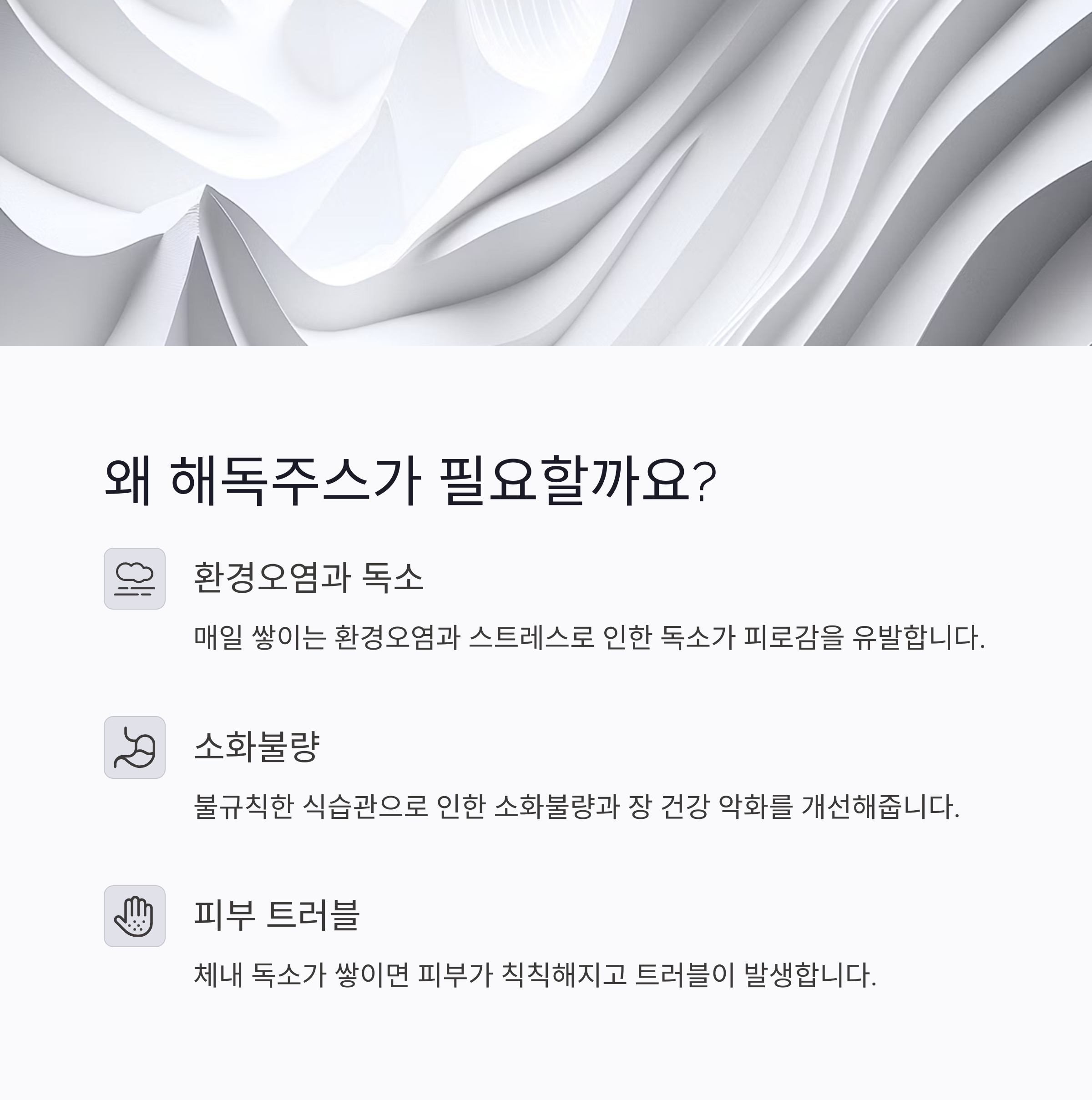 우리 몸은 매일 환경오염, 스트레스, 불규칙한 식습관 등으로 인해 독소가 쌓입니다. 이런 독소들은 피로감, 소화불량, 피부 트러블 등 다양한 증상을 유발하죠. 해독주스는 자연 재료만을 활용해 간과 장의 기능을 도와 독소를 배출하는 데 도움을 줍니다. 특히 다이어트 중에도 체내 밸런스를 유지하는 데 효과적이죠. 피부가 칙칙하거나, 변비가 심하거나, 자꾸 피곤하다면 해독주스를 고려해보세요.