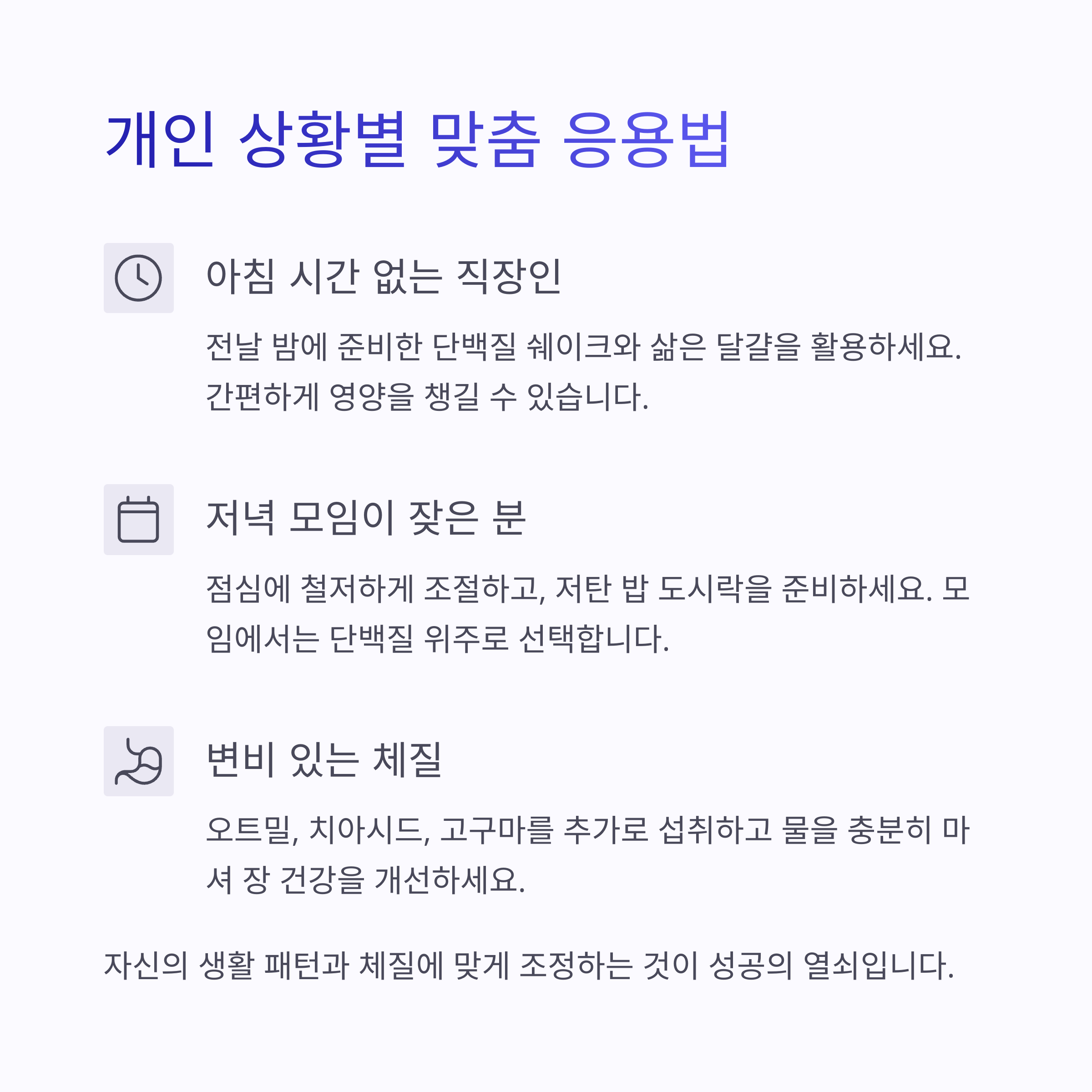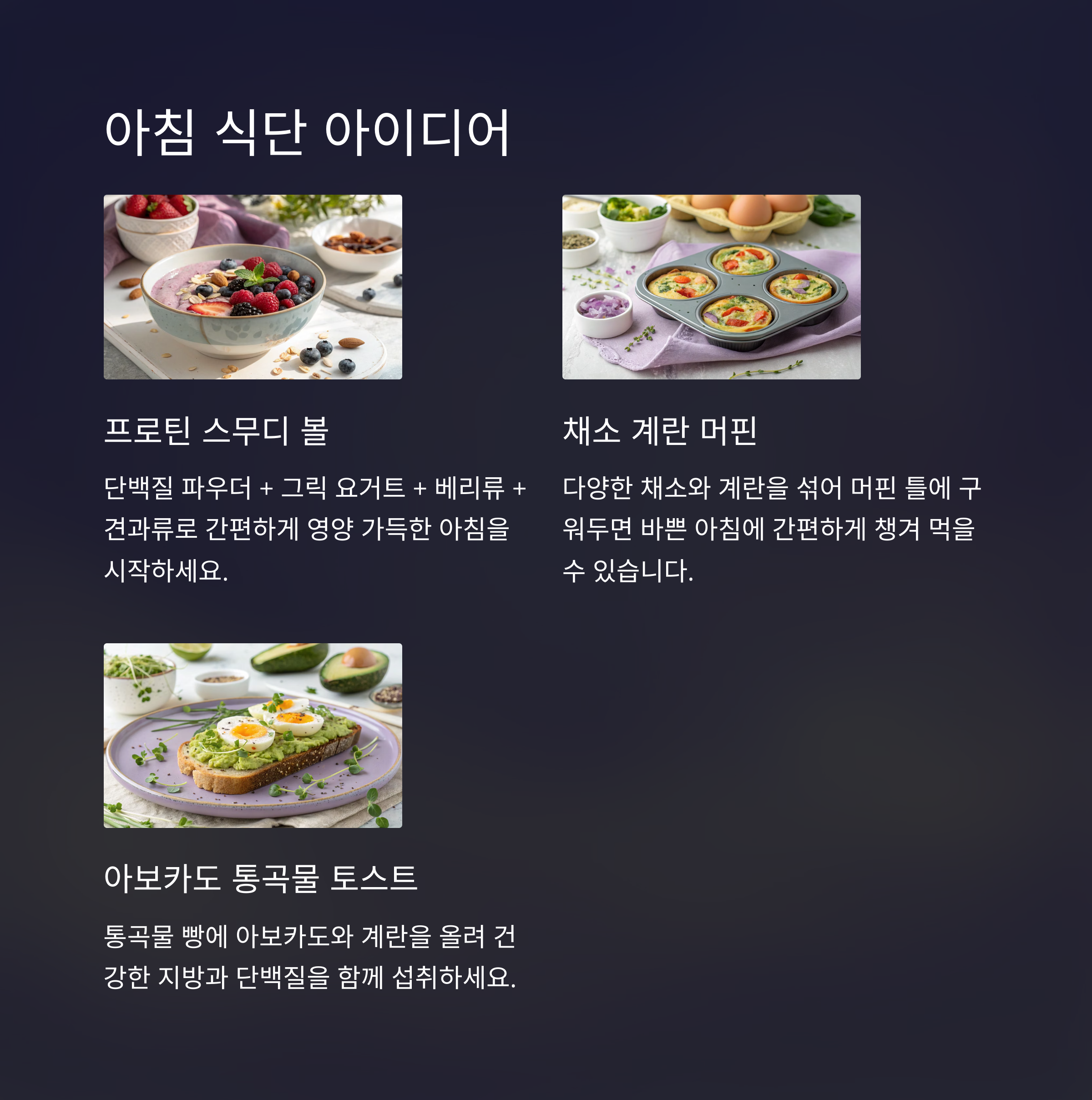 - 아침 시간 없는 직장인 → 단백질 쉐이크 + 삶은 달걀 구성 추천