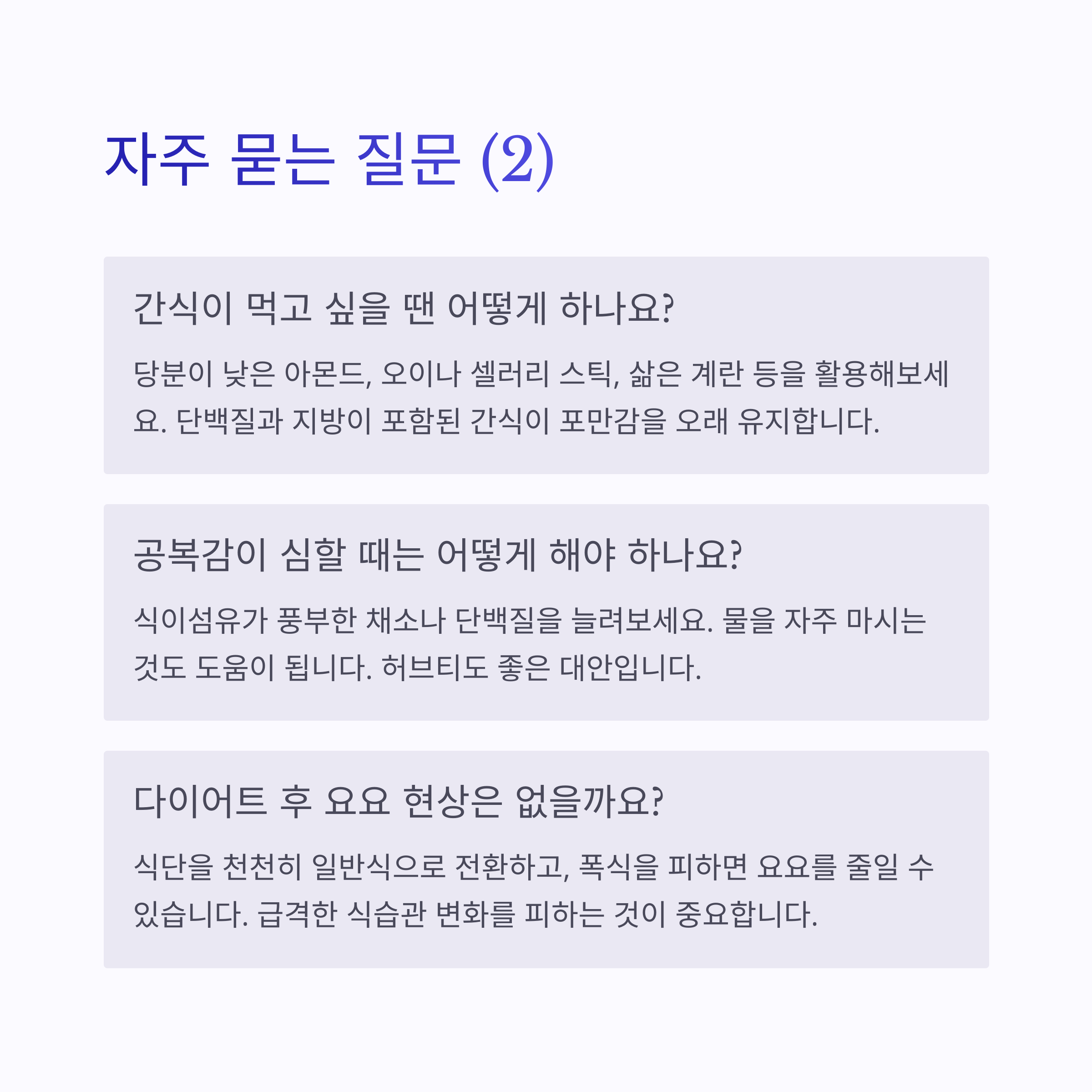 식단을 천천히 일반식으로 전환하고, 폭식을 피하면 요요를 줄일 수 있어요.
