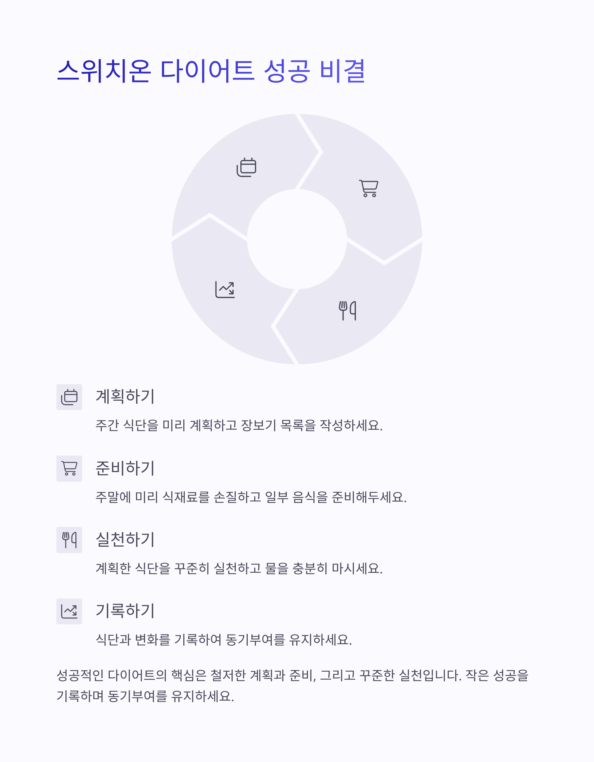 매일 뭘 먹을지 고민 끝! 스위치온 다이어트, 딱 맞는 식단표로 건강하고 빠르게 체중 감량하세요.