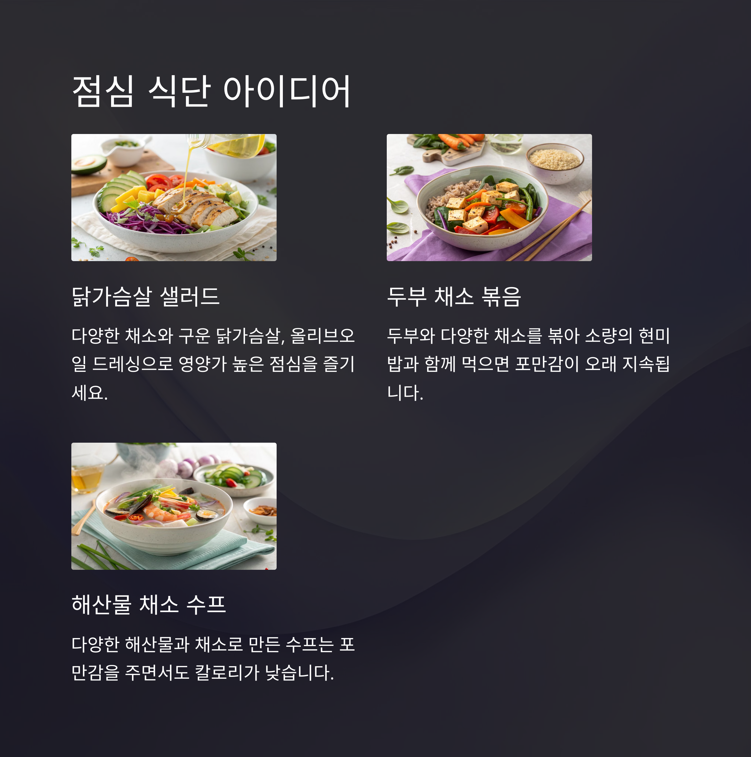 | 저탄수화물 | 백미 대신 현미, 고구마, 콜리플라워라이스 활용 |