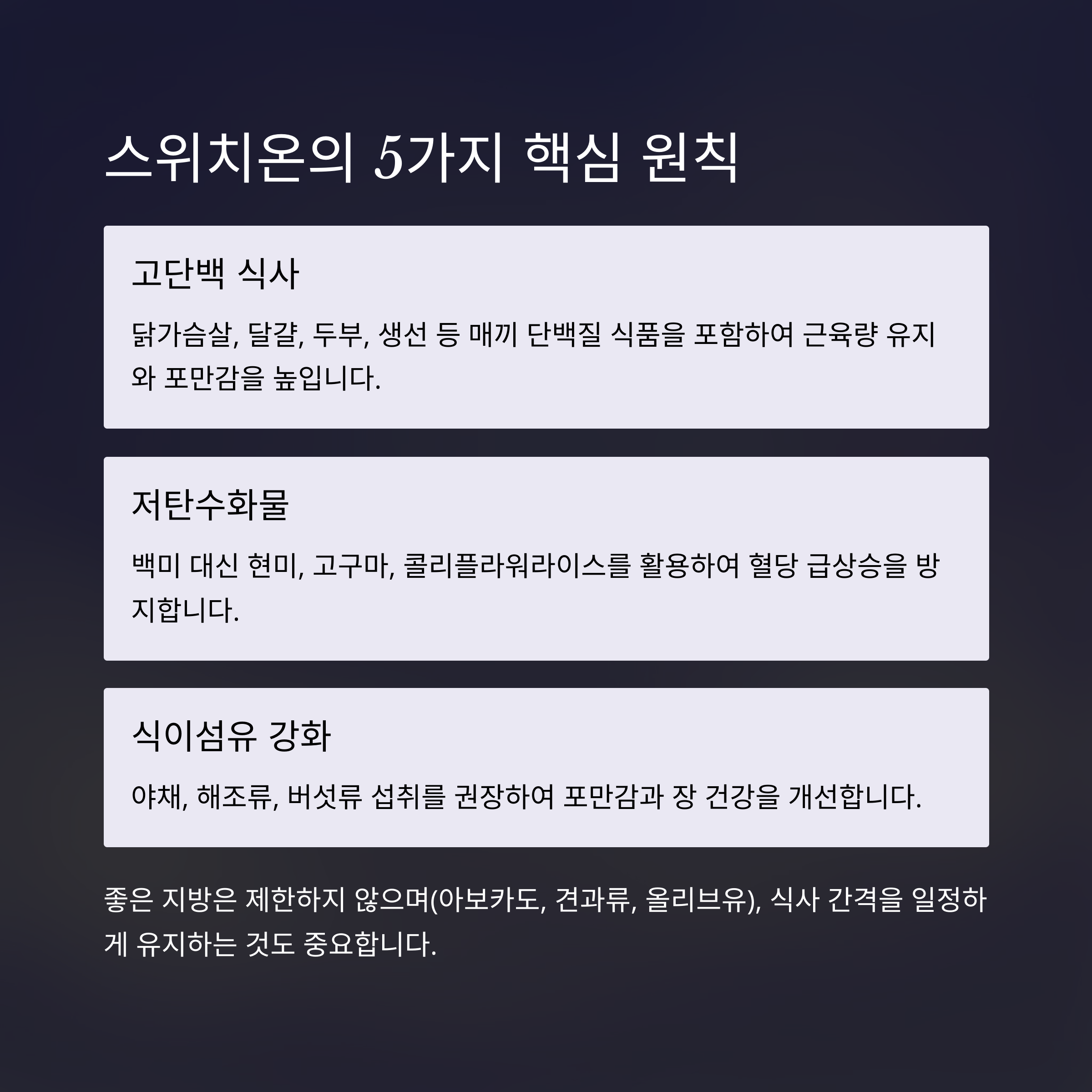 스위치온 다이어트 식단은 크게 다섯 가지 원칙에 기반해요. 단백질 중심으로, 탄수화물은 낮추되 식이섬유는 풍부하게, 좋은 지방은 꼭 챙기고, 저당 식단으로 유지하는 게 핵심이에요.