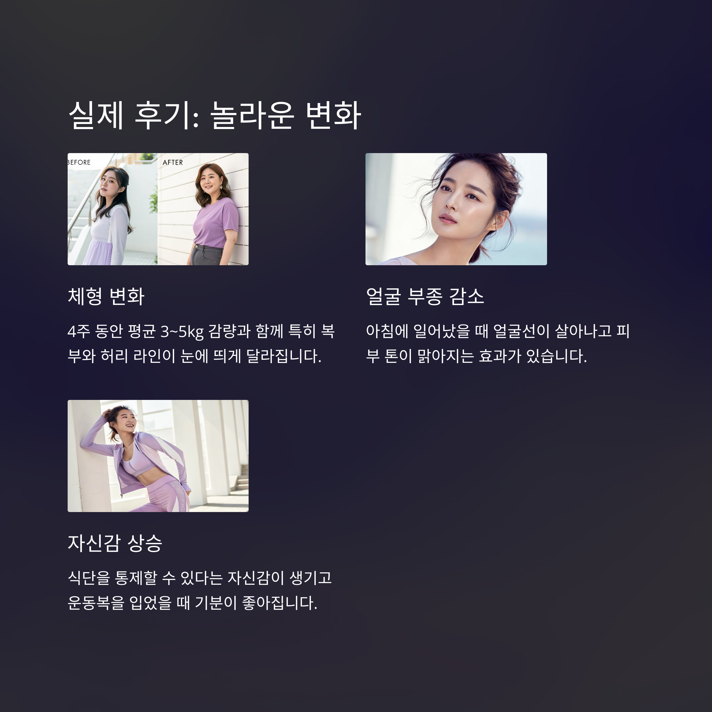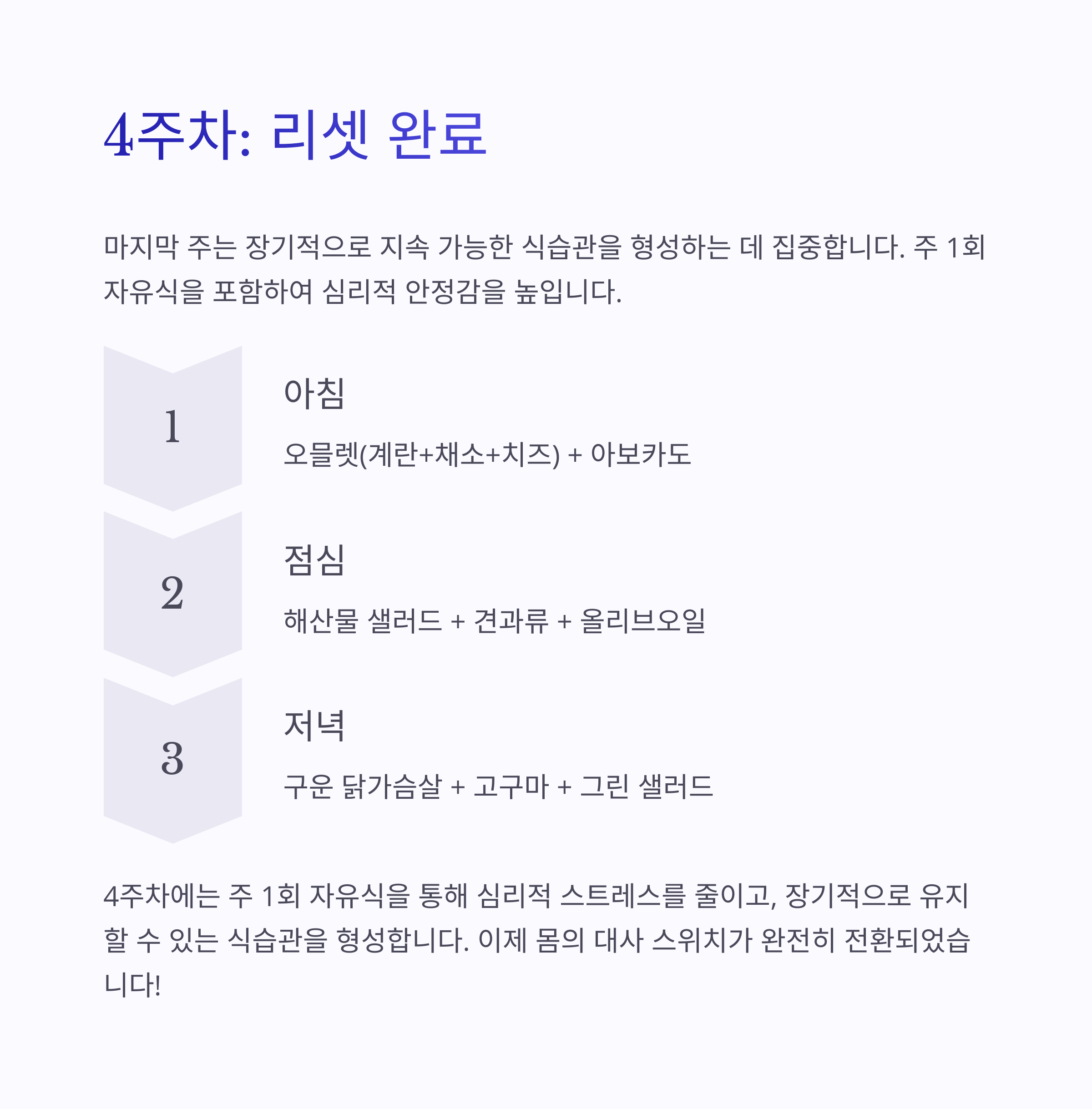 - 4주차: 리셋 완료 – 주 1회 자유식 포함, 장기 지속 가능 구조 설계