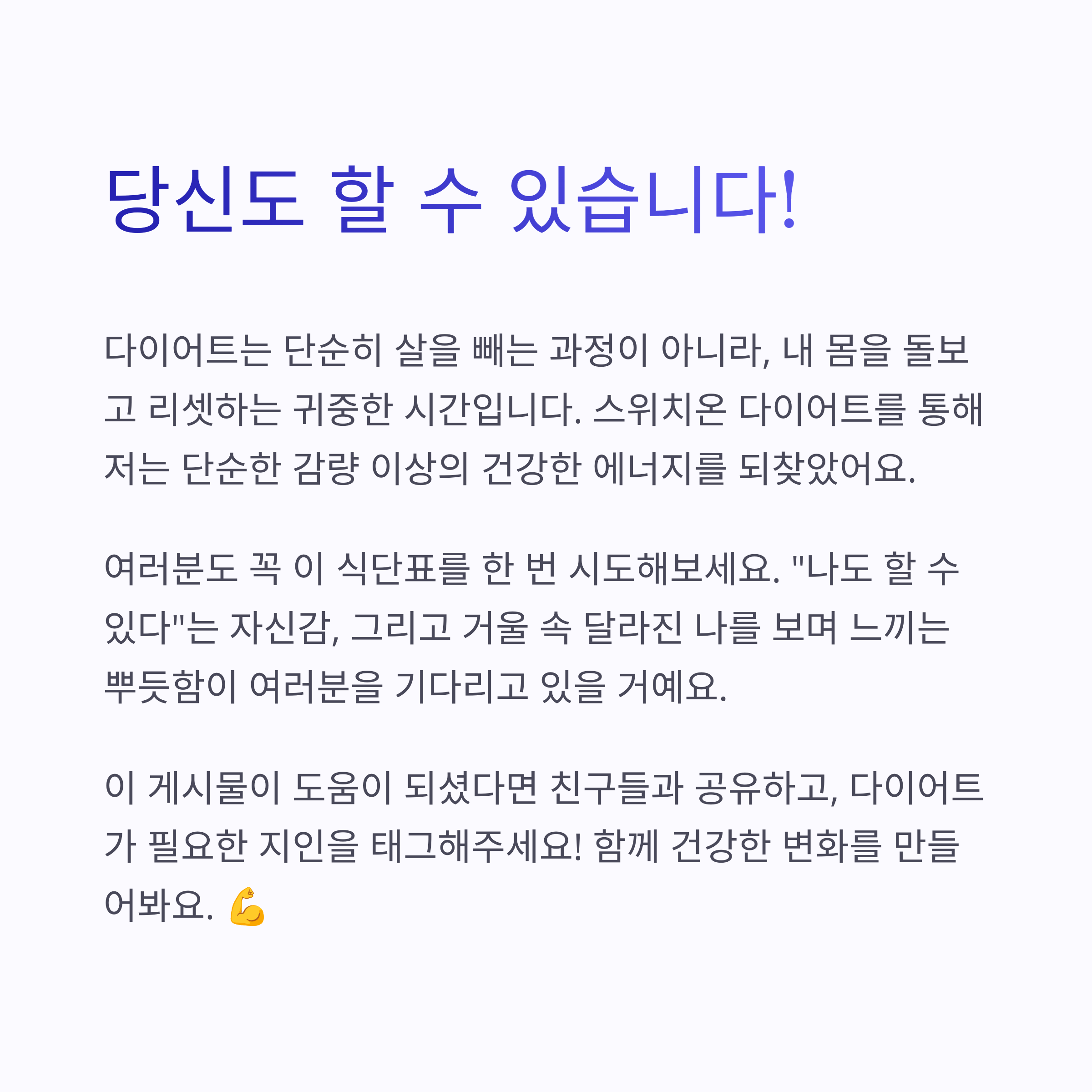 다이어트는 단순히 살을 빼는 과정이 아니라, 내 몸을 돌보고 리셋하는 귀중한 시간이더라고요. 스위치온 다이어트를 통해 저는 단순한 감량 이상의 건강한 에너지를 되찾았어요. 여러분도 꼭 이 식단표를 한 번 시도해보세요. "나도 할 수 있다"는 자신감, 그리고 거울 속 달라진 나를 보며 느끼는 뿌듯함이 여러분을 기다리고 있을 거예요. 혹시 실천 중 궁금한 점이 생기면 언제든지 댓글 남겨주세요! 함께 응원하고 팁도 나눠요 :)