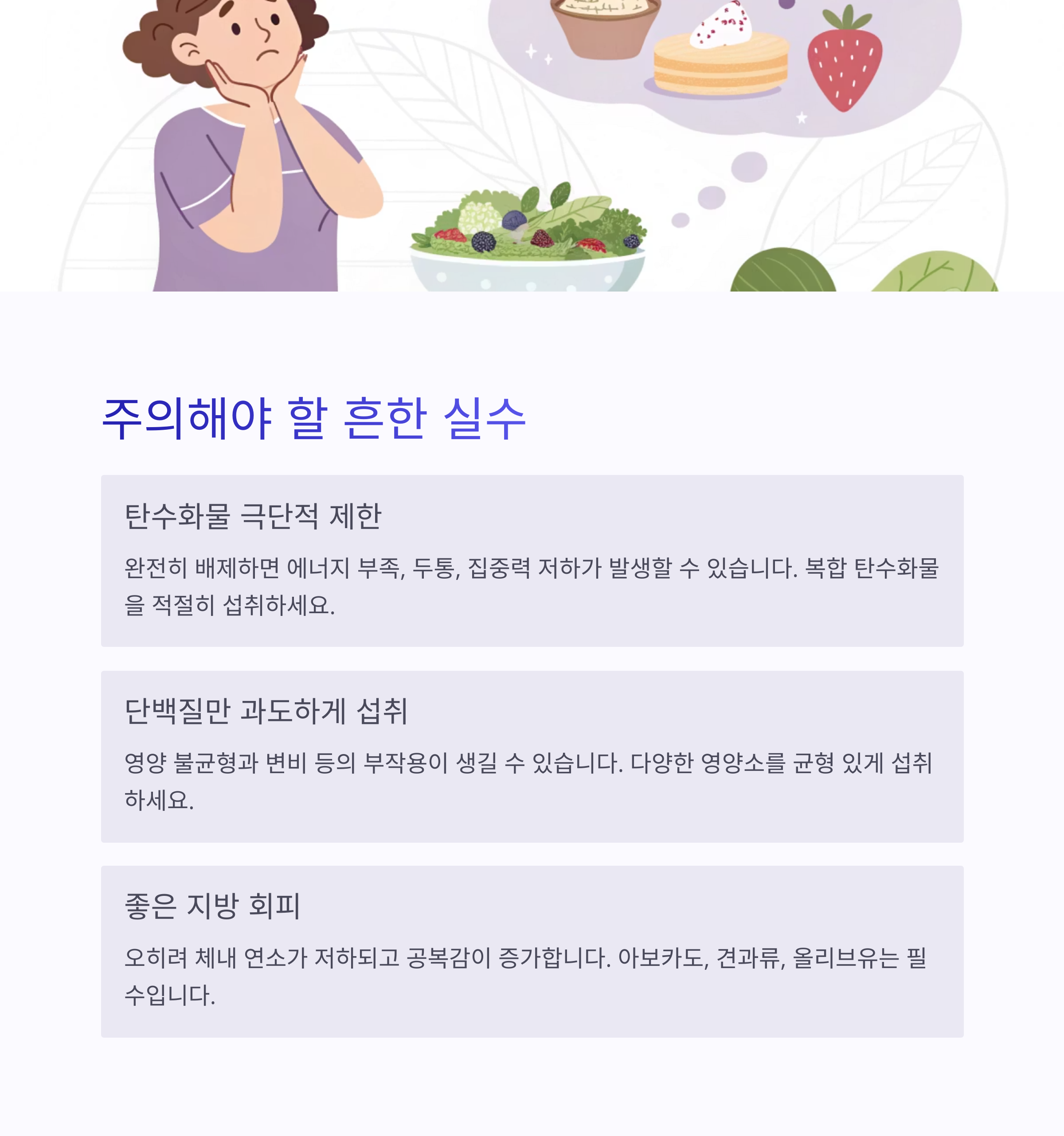 | 탄수화물 극단적 제한 | 에너지 부족, 두통, 집중력 저하 유발 |