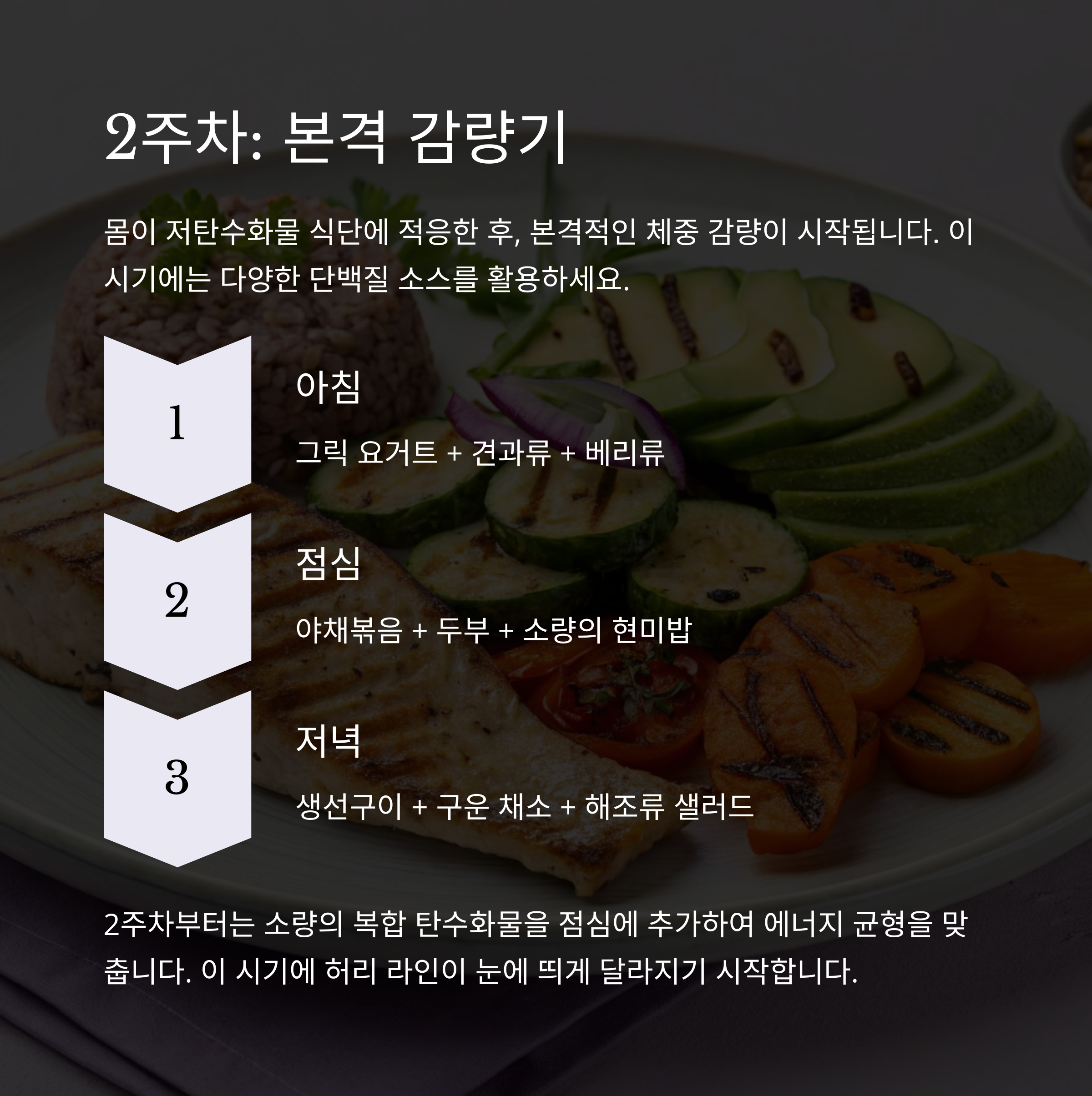 - 2주차: 본격 감량기 – 야채볶음 + 생선구이 + 저탄밥
