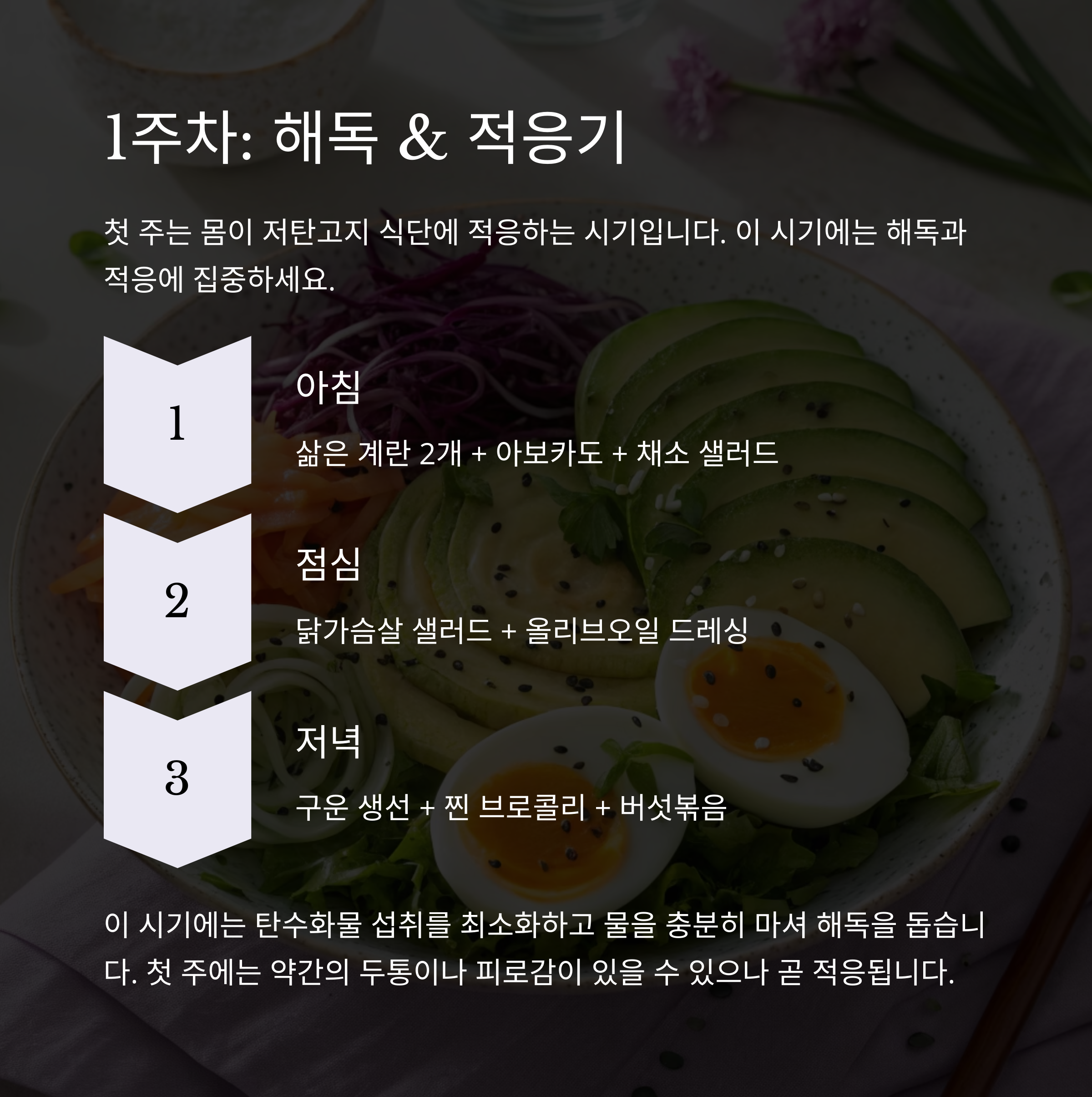 - 1주차: 해독 & 저탄고지 적응기 – 샐러드 + 계란 + 닭가슴살